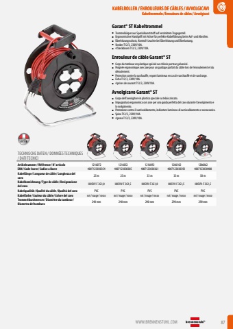 WWW.BRENNENSTUHL.COM 87KABELROLLEN /ENROULEURS DE C%u00c2BLES/ AVVOLGICAVIKabeltrommeln / Enrouleurs de c%u00e2bles/ AvvolgicaviKABELROLLEN /ENROULEURS DE C%u00c2BLES/ AVVOLGICAVIKabeltrommeln / Enrouleurs de c%u00e2bles/ AvvolgicaviKABELROLLEN /ENROULEURS DE C%u00c2BLES/ AVVOLGICAVIKabeltrommeln / Enrouleurs de c%u00e2bles/ AvvolgicaviGarant%u00ae ST Kabeltrommel%u25a0 Trommelk%u00f6rper aus Spezialkunststoff auf verzinktem Tragegestell.%u25a0 Ergonomischer Handgriff mit Achse f%u00fcr perfekte Kabelf%u00fchrung beim Auf- und Abrollen.%u25a0 %u00dcberhitzungsschutz, Kontroll-Leuchte bei %u00dcberhitzung und %u00dcberlastung.%u25a0 Stecker T12/3, 230V/10A.%u25a0 4 Steckdosen T13/3, 230V/10A.Enrouleur de c%u00e2ble Garant%u00ae ST%u25a0 Corps du tambour en plastique sp%u00e9cial sur ch%u00e2ssis porteur galvanis%u00e9.%u25a0 Poign%u00e9e ergonomique avec axe pour un guidage parfait du c%u00e2ble lors de l%u2019enroulement et du d%u00e9roulement.%u25a0 Protection contre la surchauffe, voyant lumineux en cas de surchauffe et de surcharge.%u25a0 Fiche T12/3, 230V/10A.%u25a0 4 prises de courant T13/3, 230V/10A.Avvolgicavo Garant%u00ae ST%u25a0 Corpo dell%u2019avvolgitore in plastica speciale su telaio zincato.%u25a0 Impugnatura ergonomica con asse per una guida perfetta del cavo durante l%u2019avvolgimento e lo svolgimento.%u25a0 Protezione contro il surriscaldamento, indicatore luminoso di surriscaldamento e sovraccarico.%u25a0 Spina T12/3, 230V/10A.%u25a0 4 prese T13/3, 230V/10A.TECHNISCHE DATEN / DONN%u00c9ES TECHNIQUES / DATI TECNICIArtikelnummer/ R%u00e9f%u00e9rence / N%u00b0 articolo 1216072 1216052 1216092 1206102 1206062EAN/ Code-barre / Codice a Barre 4007123030354 4007123030385 4007123030361 4007123030392 4007123030408Kabell%u00e4nge / Longueur de c%u00e2ble / Lunghezza del cavo25 m 25 m 33 m 33 m 50 mKabelbezeichnung / Type de c%u00e2ble / Designazione del cavo H05VV-F 3G1,0 H05VV-F 3G1,5 H05VV-F 3G1,0 H05VV-F 3G1,5 H05VV-F 3G1,5Kabelqualit%u00e4t/ Qualit%u00e9 du c%u00e2ble / Qualit%u00e0 del cavo PVC PVC PVC PVC PVCKabelfarbe / Couleur du c%u00e2ble / Colore del cavo rot/ rouge/ rosso rot/ rouge/ rosso rot/ rouge/ rosso rot/ rouge/ rosso rot/ rouge/ rossoTrommeldurchmesser/ Diam%u00e8tre du tambour/ Diametro del tamburo 240 mm 240 mm 240 mm 290 mm 290 mm