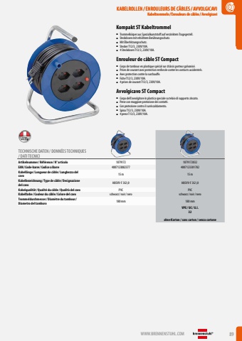 WWW.BRENNENSTUHL.COM 89KABELROLLEN /ENROULEURS DE C%u00c2BLES/ AVVOLGICAVIKabeltrommeln / Enrouleurs de c%u00e2bles/ AvvolgicaviKABELROLLEN /ENROULEURS DE C%u00c2BLES/ AVVOLGICAVIKabeltrommeln / Enrouleurs de c%u00e2bles/ AvvolgicaviKABELROLLEN /ENROULEURS DE C%u00c2BLES/ AVVOLGICAVIKabeltrommeln / Enrouleurs de c%u00e2bles/ AvvolgicaviKompakt ST Kabeltrommel%u25a0 Trommelk%u00f6rper aus Spezialkunststoff auf verzinktem Tragegestell.%u25a0 Steckdosen mit erh%u00f6htem Ber%u00fchrungsschutz.%u25a0 Mit %u00dcberhitzungsschutz.%u25a0 Stecker T12/3, 230V/10A.%u25a0 4 Steckdosen T13/3, 230V/10A.Enrouleur de c%u00e2ble ST Compact%u25a0 Corps de tambour en plastique sp%u00e9cial sur ch%u00e2ssis porteur galvanis%u00e9.%u25a0 Prises de courant avec protection renforc%u00e9e contre les contacts accidentels.%u25a0 Avec protection contre la surchauffe.%u25a0 Fiche T12/3, 230V/10A.%u25a0 4 prises de courant T13/3, 230V/10A.Avvolgicavo ST Compact%u25a0 Corpo dell%u2019avvolgitore in plastica speciale su telaio di supporto zincato.%u25a0 Prese con maggiore protezione dei contatti.%u25a0 Con protezione contro il surriscaldamento.%u25a0 Spina T12/3, 230V/10A.%u25a0 4 prese T13/3, 230V/10A.TECHNISCHE DATEN / DONN%u00c9ES TECHNIQUES / DATI TECNICIArtikelnummer/ R%u00e9f%u00e9rence / N%u00b0 articolo 1079172 1079172032EAN/ Code-barre / Codice a Barre 4007123082377 4007123301782Kabell%u00e4nge / Longueur de c%u00e2ble / Lunghezza del cavo15 m 15 mKabelbezeichnung / Type de c%u00e2ble / Designazione del cavo H05VV-F 3G1,0 H05VV-F 3G1,0Kabelqualit%u00e4t/ Qualit%u00e9 du c%u00e2ble / Qualit%u00e0 del cavo PVC PVCKabelfarbe / Couleur du c%u00e2ble / Colore del cavo schwarz/ noir/ nero schwarz/ noir/ neroTrommeldurchmesser/ Diam%u00e8tre du tambour/ Diametro del tamburo 180 mm 180 mmVPE / UC / U.I. 32ohne Karton / sans carton / senza cartone