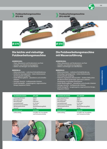%u00d8370 %u00d8370TECHNISCHE DATEN EPG 400Leistungsaufnahme 500 WNennspannung 230 V ~Nenndrehzahl 0-60 min-1Leerlaufdrehzahl 0-110 min-1Durchmesser Grundteller 370 mmWerkzeugaufnahme Steckverbindung/KlettGewicht 3,5 kgBestellnummer 06509000Lieferumfang im Koffer inkl. Grundtellerund SchwammscheibeTECHNISCHE DATEN EPG 400 WPLeistungsaufnahme 500 WNennspannung 230 V ~Nenndrehzahl 0-60 min-1Leerlaufdrehzahl 0-110 min-1Durchmesser Grundteller 370 mmWerkzeugaufnahme Steckverbindung/KlettGewicht 3,8 kgBestellnummer 0650L000Lieferumfang im Koffer inkl. Grundtellerund SchwammscheibeDie leichte und vielseitigePutzbearbeitungsmaschineANWENDUNG:%u2013 Filzen, Rabottieren und Strukturieren von Putz%u2013 Schleifen von Vollw%u00e4rmeschutzplatten%u2013 Gl%u00e4tten und Reinigen von Oberfl%u00e4chenMERKMALE:%u2013 Elektronikschalter %u2013 stufenlose Drehzahl%u00e4nderung%u2013 Dreifaches Spezialgetriebe %u2013 hohes Drehmoment, durchzugsstark, langlebig%u2013 Gro%u00dfe Werkzeugfl%u00e4che %u2013 planebenes und schnelles Arbeiten%u2013 Geringes Gewicht %u2013 kraftsparendes Arbeiten%u2013 Gro%u00dfe Handgriffe %u2013 ausgewogenes, ergonomisches Design, bequemes F%u00fchrenPutzbearbeitungsmaschineEPG 400Die Putzbearbeitungsmaschine mit Wasserzuf%u00fchrungANWENDUNG:%u2013 Filzen, Rabottieren und Strukturieren von Putz%u2013 Schleifen von Vollw%u00e4rmeschutzplatten%u2013 Gl%u00e4tten und Reinigen von Oberfl%u00e4chenMERKMALE:%u2013 Elektronikschalter %u2013 stufenlose Drehzahl%u00e4nderung%u2013 Dreistufiges Spezialgetriebe %u2013 hohes Drehmoment, durchzugsstark, langlebig%u2013 Stufenlos regulierbare Wasserzufuhr %u2013 direktes Befeuchten der Wand mittels Spr%u00fchnebel, spart einen weiteren Arbeitsgang, nochmalige Zeitersparnis%u2013 Gro%u00dfe Werkzeugfl%u00e4che %u2013 planebenes und schnelles Arbeiten%u2013 Geringes Gewicht %u2013 kraftsparendes Arbeiten%u2013 Gro%u00dfe Handgriffe %u2013 ausgewogenes, ergonomisches Design, bequemes F%u00fchrenPutzbearbeitungsmaschineEPG 400 WPmind. 40 %ZeitersparnisSCHLEIFEN/FR%u00c4SEN/GL%u00c4TTENmind. 50 %Zeitersparnis103