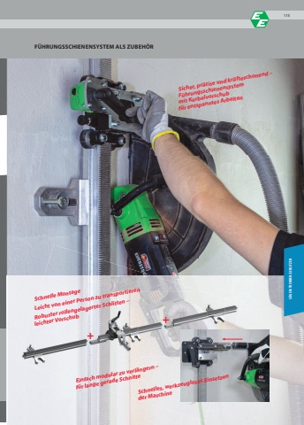 ++F%u00dcHRUNGSSCHIENENSYSTEM ALS ZUBEH%u00d6RSicher, pr%u00e4zise und kr%u00e4fteschonend %u2013F%u00fchrungsschienensystemmit Kurbelvorschubf%u00fcr entspanntes ArbeitenSchnelle MontageLeicht von einer Person zu transportierenRobuster rollengelagerter Schlitten %u2013leichter VorschubEinfach modular zu verl%u00e4ngern %u2013f%u00fcr lange gerade SchnitteSchnelles, werkzeugloses Einsetzender MaschineS%u00c4GEN/TRENNEN/SCHLITZEN115