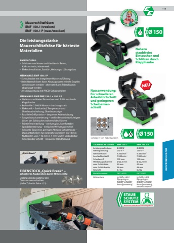 %u00d8150%u00d8150Die leistungsstarke Mauerschlitzfr%u00e4se f%u00fcr h%u00e4rteste MaterialienANWENDUNG:%u2013 Schlitzen von Nuten und Kan%u00e4len in Beton, Kalksandstein, Mauerwerk%u2013 Elektroinstallation, Sanit%u00e4r-, Heizungs-, L%u00fcftungsbauMERKMALE: EMF 150.1 P%u2013 Schutzhaube mit integrierter Wasserzuf%u00fchrung%u2013 Beim Nassschlitzen kann Absaugstutzen mittels Stopfen verschlossen werden - alternativ kann Fr%u00e4sschlamm abgesaugt werden%u2013 Anschlussleitung mit PRCD-SchutzschalterMERKMALE: EMF EMF 150.1 + 150.1 P%u2013 Nahezu staubfreies Eintauchen und Schlitzen durch Klapphaube%u2013 kraftvoller 2.300 W Motor %u2013 durchzugsstark%u2013 Elektronik %u2013 Sanftanlauf, Temperatur- und %u00dcberlastabschaltung, %u00dcberlastanzeige%u2013 Parallele Griffposition %u2013 bequeme Arbeitshaltung%u2013 Saugschlaucharretierung %u2013 verhindert unbeabsichtigtes L%u00f6sen des Schlauches w%u00e4hrend des Fr%u00e4sens%u2013 Fr%u00e4stiefeneinstellung %u2013 werkzeuglos, komfortabel%u2013 Spindelarretierung %u2013 einfacher Werkzeugwechsel%u2013 Schlanke Bauweise, geringer Abstand Schutzhaube %u2013 Diamantscheiben f%u00fcr randnahes Arbeiten bis 18 mm%u2013 Nutbreiten von 7-46 mm in 1 mm Stufen ver%u00e4nderbar%u2013 Schiebender Schnitt %u2013 bequeme HandhabungMauerschlitzfr%u00e4senEMF 150.1 (trocken)EMF 150.1 P (nass/trocken)TECHNISCHE DATEN EMF 150.1 EMF 150.1 PLeistungsaufnahme 2.300 W 2.300 WNennspannung 230 V ~ 230 V ~Nenndrehzahl 4.300 min-1 4.300 min-1Leerlaufdrehzahl 7.500 min-1 7.500 min-1Scheiben-%u00d8 150 mm 150 mmWerkzeugaufnahme %u00d8 22,2 mm %u00d8 22,2 mmmax. Schlitztiefe 45 mm 45 mmmax. Schlitzbreite 46 mm 46 mmGewicht 6,1 kg 6,2 kgBestellnummer 0671A000 0671P000Lieferumfang im Koffer inkl. 2 Diamanttrennscheiben Premium (Beton), Ausbrech-, Montagewerkzeugim Koffer inkl. 2 Diamanttrennscheiben Premium (Beton), Ausbrech-, Montagewerkzeug, VerschlussstopfenSchlitzen von Kabelkan%u00e4lenEIBENSTOCK %u201eQuick Break%u201c %u2013 schnelleres Ausbrechen durch MittelschlitzDistanzscheibensatz f%u00fcr dreiDiamanttrennscheiben(siehe Zubeh%u00f6r Seite 122)S%u00c4GEN/TRENNEN/SCHLITZENSTAUBSCHUTZSYSTEMMineralische St%u00e4ube k%u00f6nnen krebserzeugend sein!%u201eQuick Break%u201cNahezustaubfreiesEintauchen undSchlitzen durchKlapphaubeNassanwendung: F%u00fcr schnelleren Arbeitsfortschritt und geringerenScheibenverschlei%u00df119