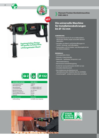 2 %u00d8132Die universelle Maschinef%u00fcr Installationsbohrungenbis %u00d8 132 mmANWENDUNG:%u2013 Trockenbohren bis %u00d8 132 mm in Kalksandstein, Mauerwerk, Klinker, Ziegel und andere abrasive Materialien%u2013 Herstellen von Wand- und Decken%u00f6ffnungen im Sanit%u00e4r-, Heizungs- und L%u00fcftungsbau%u2013 Dosensenken, z.B. f%u00fcr Schalter- und Abzweigdosen bei der ElektroinstallationMERKMALE:%u2013 Leistungsstarker Motor%u2013 Robustes 2-Gang Getriebe%u2013 Elektronik %u2013 Sanftanlauf, Temperatur- und %u00dcberlastabschaltung%u2013 Mechanische Sicherheitskupplung%u2013 Perfekt f%u00fcr hochverdichtenden KS (RDV 2,4-3,6)%u2013 Schnellerer Bohrfortschritt%u2013 Kein Verklemmen der Bohrkrone mit Spezialdosensenker (Zubeh%u00f6r, Best-Nr.:35478000)%u2013 Zusatzhandgriff - variabel am Spannhals verstellbarDiamant-Trocken-KernbohrmaschineEHD 2002 STECHNISCHE DATEN EHD 2002 SLeistungsaufnahme 1.800 WNennspannung 230 V ~Nenndrehzahl 0-1.000/0-2.000 min-1Leerlaufdrehzahl 0-1.500/0-3.000 min-1Bohrdurchmesser 32-132 mmWerkzeugaufnahme M 18 aSpannhalsdurchmesser 53 mmGewicht 5,9 kgBestellnummer 0332L000Lieferumfang im Koffer ohne Zubeh%u00f6rSTAUBSCHUTZSYSTEMMineralische St%u00e4ube k%u00f6nnen krebserzeugend sein!Ergonomisches Designmit gro%u00dfer SchaltertasteLeistungsstarker Motor24