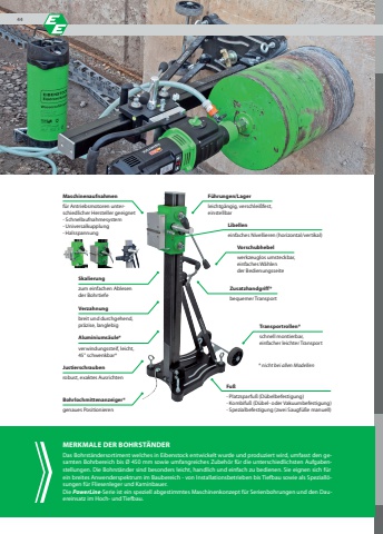 MERKMALE DER BOHRST%u00c4NDERDas Bohrst%u00e4ndersortiment welches in Eibenstock entwickelt wurde und produziert wird, umfasst den gesamten Bohrbereich bis %u00d8 450 mm sowie umfangreiches Zubeh%u00f6r f%u00fcr die unterschiedlichsten Aufgabenstellungen. Die Bohrst%u00e4nder sind besonders leicht, handlich und einfach zu bedienen. Sie eignen sich f%u00fcr ein breites Anwenderspektrum im Baubereich - von Installationsbetrieben bis Tiefbau sowie als Speziall%u00f6sungen f%u00fcr Fliesenleger und Kaminbauer. Die PowerLine-Serie ist ein speziell abgestimmtes Maschinenkonzept f%u00fcr Serienbohrungen und den Dauereinsatz im Hoch- und Tiefbau.F%u00fchrungen/Lagerleichtg%u00e4ngig, verschlei%u00dffest,einstellbarBohrlochmittenanzeiger*genaues PositionierenVerzahnungbreit und durchgehend,pr%u00e4zise, langlebigSkalierungzum einfachen Ablesender BohrtiefeZusatzhandgriff*bequemer TransportJustierschraubenrobust, exaktes AusrichtenTransportrollen*schnell montierbar,einfacher leichter TransportMaschinenaufnahmenf%u00fcr Antriebsmotoren unterschiedlicher Hersteller geeignet- Schnellaufnahmesystem- Universalkupplung- HalsspannungAluminiums%u00e4ule*verwindungssteif, leicht,45%u00b0 schwenkbar*Vorschubhebelwerkzeuglos umsteckbar,einfaches W%u00e4hlender Bedienungsseite* nicht bei allen ModellenFu%u00df- Platzsparfu%u00df (D%u00fcbelbefestigung)- Kombifu%u00df (D%u00fcbel- oder Vakuumbefestigung)- Spezialbefestigung (zwei Saugf%u00fc%u00dfe manuell)Libelleneinfaches Nivellieren (horizontal/vertikal)44