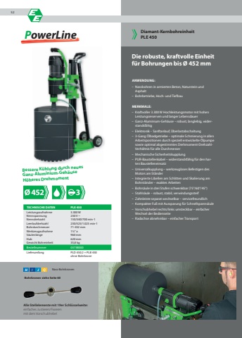 %u00d8452 3PowerLineH I J Q Die robuste, kraftvolle Einheitf%u00fcr Bohrungen bis %u00d8 452 mm ANWENDUNG:%u2013 Nassbohren in armierten Beton, Naturstein und Asphalt%u2013 Bohrbetriebe, Hoch- und TiefbauMERKMALE:%u2013 Kraftvoller 3.300 W Hochleistungsmotor mit hohen Leistungsreserven und langer Lebensdauer%u2013 Ganz-Aluminium-Geh%u00e4use %u2013 robust, langlebig, widerstandsf%u00e4hig%u2013 Elektronik %u2013 Sanftanlauf, %u00dcberlastabschaltung%u2013 3-Gang %u00d6lbadgetriebe %u2013 optimale Schmierung in allen Arbeitspositionen durch speziell entwickelte %u00d6lpumpe sowie optimal abgestimmtes Drehmoment-DrehzahlVerh%u00e4ltnis f%u00fcr alle Durchmesser %u2013 Mechanische Sicherheitskupplung%u2013 PUR-Baustellenkabel %u2013 widerstandsf%u00e4hig f%u00fcr den harten Baustelleneinsatz%u2013 Universalkupplung %u2013 werkzeugloses Befestigen des Motors am St%u00e4nder%u2013 Integrierte Libellen am Schlitten und Skalierung am Bohrst%u00e4nder %u2013 exaktes Arbeiten%u2013 Bohrs%u00e4ule in drei Stufen schwenkbar (75%u00b0/60%u00b0/45%u00b0)%u2013 Stahls%u00e4ule %u2013 robust, stabil, verwindungssteif%u2013 Zahnleiste separat wechselbar %u2013 servicefreundlich%u2013 Kompakter Fu%u00df mit Aussparung f%u00fcr Schnellspanns%u00e4ule%u2013 Vorschubhebel rechts/links umsteckbar %u2013 einfacher Wechsel der Bedienseite%u2013 Radachse abnehmbar %u2013 einfacher TransportDiamant-KernbohreinheitPLE 450TECHNISCHE DATEN PLE 450Leistungsaufnahme 3.300 WNennspannung 230 V ~Nenndrehzahl 150/340/700 min-1Leerlaufdrehzahl 230/525/1.025 min-1Bohrdurchmesser 71-452 mmWerkzeugaufnahme 1%u00bc\S%u00e4ulenl%u00e4nge 960 mmHub 620 mmGewicht Bohreinheit 35,8 kg Bestellnummer 0373B000Lieferumfang PLD 450.2 + PLB 450ohne BohrkroneAlle Stellelemente mit 19er Schl%u00fcsselweite:einfaches Justieren/Fixierenmit dem VorschubhebelBohrkronen siehe Seite 60Nass-BohrkronenBessere K%u00fchlung durch neuesGanz-Aluminium-Geh%u00e4useH%u00f6heres Drehmoment52