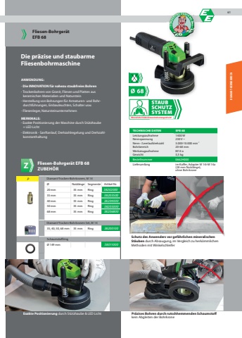 %u00d8 68P1 382020002 382035003 382040004 382050005 3820680063820010038011000%u00d8 68Fliesen-Bohrger%u00e4tEFB 68Die pr%u00e4zise und staubarmeFliesenbohrmaschineANWENDUNG:- Die INNOVATION f%u00fcr nahezu staubfreies Bohren- Trockenbohren von Granit, Fliesen und Platten aus keramischen Materialien und Naturstein- Herstellung von Bohrungen f%u00fcr Armaturen- und Rohr- durchf%u00fchrungen, Einbauleuchten, Schalter usw.- Fliesenleger, NatursteinunternehmenMERKMALE:- Exakte Positionierung der Maschine durch St%u00fctzhaube + LED Licht- Elektronik - Sanftanlauf, Drehzahlregelung und Drehzahl- konstanthaltungTECHNISCHE DATEN EFB 68Leistungsaufnahme 1400 WNennspannung 230 V ~Nenn- /Leerlaufdrehzahl 3.000-10.000 min-1Bohrbereich 20-68 mmWerkzeugaufnahme M14 aGewicht 3,5 kg Bestellnummer 0662H000Lieferumfang im Koffer, Adapter M 14i-M 14a(28 mm Nutzl%u00e4nge), ohne BohrkroneFliesen-Bohrger%u00e4t EFB 68ZUBEH%u00d6RPr%u00e4zises Bohren durch rutschhemmenden Schaumstoff kein Abgleiten der BohrkroneSchutz des Anwenders vor gef%u00e4hrlichen mineralischen St%u00e4uben durch Absaugung, im Vergleich zu herk%u00f6mmlichenMethoden mit WinkelschleiferZExakte Positionierung durch St%u00fctzhaube & LED LichtSTAUBSCHUTZSYSTEMMineralische St%u00e4ube k%u00f6nnen krebserzeugend sein!Diamant-Trocken-Bohrkronen, M 14%u00d8 Nutzl%u00e4nge Segmente Artikel-Nr.1 20 mm 35 mm Ring2 35 mm 35 mm Ring3 40 mm 35 mm Ring4 50 mm 35 mm Ring5 68 mm 35 mm RingDiamant-Trocken-Bohrkronen Set, M 1435, 40, 50, 68 mm 35 mm RingSchaumstoffringSchaumstoffring%u00d8 149 mmDIAMANT-KERNBOHREN61