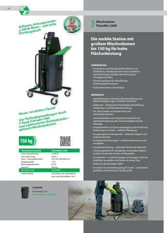 150 kgTECHNISCHE DATEN FLOORMIX 2300Leistungsaufnahme 2.300 WNennspannung 230 V ~Nenn- /Leerlaufdrehzahl 70/130/160/280 min-1Beh%u00e4ltergr%u00f6%u00dfe 110 lWerkzeugaufnahme M 16Gewicht 48,0 kgBestellnummer 07625000Lieferumfang auf Palette inkl. Spezialr%u00fchrquirl und Mischk%u00fcbel 110 lMischstationFloorMix 2300Die mobile Station mit gro%u00dfem Mischvolumen bis 150 kg f%u00fcr hohe Fl%u00e4chenleistungANWENDUNG:%u2013 Homogenes und klumpenfreies Mischen von Flie%u00dfestrich, Nivellierspachtel, faserverst%u00e4rkten Spachtelmassen, farbigen Beschichtungen, Fl%u00fcssigkunststoffen%u2013 Optimal geeignet f%u00fcr d%u00fcnnfl%u00fcssige Bodenausgleichsmassen%u2013 Fu%u00dfbodensanierer, FliesenlegerMERKMALE:%u2013 Spezialr%u00fchrquirl verhindert Klumpenbildung und Materialablagerungen an Boden und Rand%u2013 Elektronik %u2013 Sanftanlauf, Drehzahlkonstanthaltung, Temperatur- und %u00dcberlastabschaltung%u2013 Ein-/Ausschalter mit Staubschutz und Wiederanlaufschutz%u2013 Anmischfunktion mit reduzierter Drehzahl und optimale Anpassung der Geschwindigkeit auf das Mischgut%u2013 Antriebseinheit mit Quirl werkzeuglos und schnell von K%u00fcbelwagen trennbar %u2013 einfache Reinigung%u2013 Ausgewogener Schwerpunkt %u2013 einfaches Kippen und pr%u00e4zises Dosieren%u2013 Kompakte Abmessungen %u2013 leichtes Man%u00f6vrieren und Ausgie%u00dfen%u2013 Ausgie%u00dfvorrichtung %u2013 optimaler Verlauf des Materials%u2013 Transportgestell mit Handgriffen und gro%u00dfen R%u00e4dern %u2013 mobiler Einsatz der Station auf Baustellen%u2013 4 Lenkrollen %u2013 in alle Richtungen zu bewegen, h%u00f6chste Mobilit%u00e4t, Ausgie%u00dfen und Fahren in einem Zug%u2013 Robuster, dickwandiger K%u00fcbel%u2013 Anschluss f%u00fcr Staubabsaugung %u00d8 35 mm %u2013 staubarmes Einf%u00fcllen und Anmischen der BaustoffeVier Drehzahleinstellungen durch2-Gang-Getriebe UNDzwei elektronische Drehzahlstufen %u2013optimale MischergebnisseRobuster, leistungsstarker2.300 W Motor %u2013 sehr hoheDurchzugskraftNeues, verst%u00e4rktes GestellZUBEH%u00d6RMischk%u00fcbel 110 lBestellnummer: 3234300076