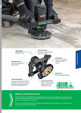 Die Betonschleifer von EIBENSTOCK setzen Ma%u00dfst%u00e4be in Bezug auf ihre Handlichkeit. Das spezielle Design mit paralleler Griff position er%u00f6ff net dem Bediener zahlreiche Vorteile wie bequemes und ausbalanciertes F%u00fchren %u2013 auch beim Arbeiten %u00fcber Kopf. Die Luft f%u00fcr die Motork%u00fchlung wird au%u00dferhalb des Staubbereiches angesaugt, was eine deutliche Erh%u00f6hung der Lebensdauer mit sich bringt.MERKMALE DER BETONSCHLEIFERMotoranordnungsenkrecht in staubarmer Zone %u2013lange LebensdauerSchutzhaubeVorderteil hochklappbar,randnahes Arbeitenm%u00f6glichB%u00fcrstenkranzSchutz vor StaubentwicklungAbdeckkappeschlagz%u00e4h, robustStaubsaugeranschluss%u00d8 35 mm - Absaugstutzen, Direktanschluss eines EIBENSTOCK SaugersVibrationsd%u00e4mpfungTrennung zwischen Motor und Griff (patentiert) %u2013 effiziente Schwingungsd%u00e4mpfung, Schonung der Handgelenke, besseres SchleifergebnisDrehzahlregelungAnpassung der Drehzahl(EBS 125.4 RO)SCHLEIFEN/FR%u00c4SEN/GL%u00c4TTENSTAUBSCHUTZSYSTEMMineralische St%u00e4ube k%u00f6nnen krebserzeugend sein!