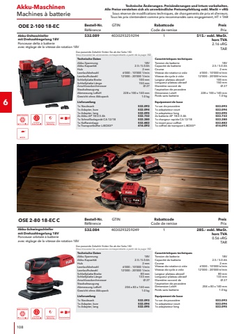 Technische %u00c4nderungen. Preis%u00e4nderungen und Irrtum vorbehalten.Alle Preise verstehen sich als unverbindliche Preisempfehlung exkl. MwSt + vRGSous r%u00e9serve de modifications techniques, de changements de prix et d%u2019erreurs. Tous les prix s%u2018entendent comme prix recommand%u00e9s sans engagement, HT + TAR12WinkelschleiferMeuleses d%u2018angle2Technische DatenLeistungsaufnahme1500 WLeistungsabgabe960 WSpannung230 VFrequenz50/60 HzMax. Scheibendurchmesser125 mmLeerlaufdrehzahl11%u2018500 1/minWerkzeugaufnahmeM14Kabell%u00e4nge4.0 mAbmessung LxBxH310 x 75 x 105 mmGewicht2.3 kgLieferumfang1x Schutzhaube Schleifen436.8601x SoftVib-Handgriff530.9031x Spannflansch335.2821x Spannmutter M14100.080Caract%u00e9ristiques techniquesPuissance absorb%u00e9e1500 WPuissance utile960 WTension230 VFr%u00e9quence50/60 HzDiam%u00e8tre de disque max.125 mmVitesse de rotation %u00e0 vide11%u2018500 tr/minEmmanchementM14Longueur de c%u00e2ble4.0 mDimension LxlxH310 x 75 x 105 mmPoids2.3 kgEquipement de base1x carter de protection du pon%u00e7age436.8601x poign%u00e9e SoftVib530.9031x bride de serrage335.2821x ecrou de serrage M14100.080L 15-11 125Bestell-Nr.R%u00e9f%u00e9renceGTINRabattcodeCode de remisePreisPrix1500 Watt Winkelschleifer, 125 mmMeuleuse d%u2018angle 1500 Watt, 125 mm447.69240302931973121215.%u2013 exkl. MwSt. hors TVA 0.56 vRGTARTechnische DatenLeistungsaufnahme1500 WLeistungsabgabe960 WSpannung230 VFrequenz50/60 HzMax. Scheibendurchmesser125 mmLeerlaufdrehzahl2%u2018800 %u201311%u2018500 1/minWerkzeugaufnahmeM14Kabell%u00e4nge4.0 mAbmessung LxBxH310 x 75 x 105 mmGewicht2.3 kgLieferumfang1x Schutzhaube Schleifen436.8601x SoftVib-Handgriff530.9031x Spannflansch335.2821x Spannmutter M14100.080Caract%u00e9ristiques techniquesPuissance absorb%u00e9e1500 WPuissance utile960 WTension230 VFr%u00e9quence50/60 HzDiam%u00e8tre de disque max.125 mmVitesse de rotation %u00e0 vide2%u2018800 %u2013 11%u2018500 tr/minEmmanchementM14Longueur de c%u00e2ble4.0 mDimension LxlxH310 x 75 x 105 mmPoids2.3 kgEquipement de base1x carter de protection du pon%u00e7age436.8601x poign%u00e9e SoftVib530.9031x bride de serrage335.2821x ecrou de serrage M14100.080LE 15-11 125Bestell-Nr.R%u00e9f%u00e9renceGTINRabattcodeCode de remisePreisPrix1500 Watt Winkelschleifer mitvariabler Drehzahl, 125 mmMeuleuse d%u2018angle 1500 Watt %u00e0 vitessede rotation variable, 125 mm447.72240302931973291240.%u2013 exkl. MwSt. hors TVA 0.56 vRGTAR