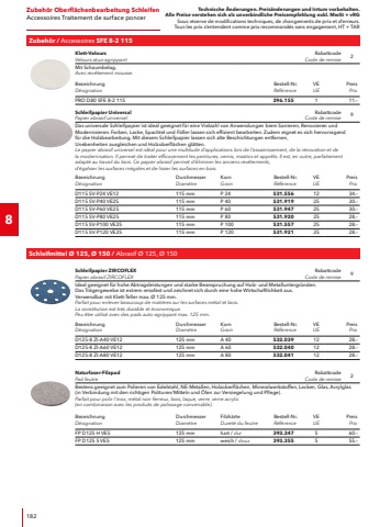 Technische %u00c4nderungen. Preis%u00e4nderungen und Irrtum vorbehalten.Alle Preise verstehen sich als unverbindliche Preisempfehlung exkl. MwSt + vRGSous r%u00e9serve de modifications techniques, de changements de prix et d%u2019erreurs. Tous les prix s%u2018entendent comme prix recommand%u00e9s sans engagement, HT + TAR18Zubeh%u00f6r WinkelschleiferAccessoires Meulese d%u2018angle2Trenn-Absaughaube f%u00fcr grosse Winkelschleifer 230 mmCarter de tron%u00e7onnage pour l%u2018aspiration de poussi%u00e8re avec meuleuse 230 mmRabattcodeCode de remise2Trenn-Absaughaube mit effizienter Staubabsaugung f%u00fcr exakte Schnitte bei Arbeiten mit Diamant-Trennscheiben in Verbindung mit 230 mm Winkelschleifern. Extrem stabil, keine Verwindung durch das seitliche Gewicht des Winkelschleifers, dank Stabilisator-Element. Bodenplatte mit Rollen f%u00fcr einen einfachen Vorschub, Seitenhandgriff wahlweise links oder rechts montierbar. Inkl. Sauganschluss f%u00fcr FLEX Clip-System und Adapter f%u00fcr F%u00fchrungsschiene. Tiefenanschlag mit Skala zur Voreinstellung der Schnitttiefe f%u00fcr die Verwendung mit oder ohne F%u00fchrungsschiene. Maximale Schnitt-Tiefe 60 mm.Capot d%u2018aspiration de tron%u00e7onnage avec aspiration efficace des poussi%u00e8res pour des coupes pr%u00e9cises lors de travaux avec des disques %u00e0 tron%u00e7onner diamant%u00e9s en combinaison avec des meuleuses d%u2018angle de 230 mm. Extr%u00eamement stable, pas de torsion due au poids lat%u00e9ral de la meuleuse d%u2018angle, gr%u00e2ce %u00e0 l%u2018%u00e9l%u00e9ment stabilisateur. Plaque de fond avec roulettes pour une avance facile, poign%u00e9e lat%u00e9rale pouvant %u00eatre mont%u00e9e au choix %u00e0 gauche ou %u00e0 droite. Raccord d%u2018aspiration pour syst%u00e8me de clipsage FLEX et adaptateur pour rail de guidage inclus. But%u00e9e de profondeur avec %u00e9chelle gradu%u00e9e pour le pr%u00e9r%u00e9glage de la profondeur de coupe pour l%u2018utilisation avec ou sans rail de guidage. Profondeur de coupe maximale de 60 mm.BezeichnungD%u00e9signationDurchmesserDiam%u00e8treBestell-Nr.R%u00e9f%u00e9renceVEUEPreis PrixDCG AG 230230 mm471.8951239.%u2013Schutzhauben-Deckel-Trennen, universalCouvercle pour capot de protection, universelRabattcodeCode de remise2Zur werkzeuglosen Umr%u00fcstung der vorhandenen Schutzhaube f%u00fcr Trennarbeiten.Pour transformer sans outil le capot de protection existant pour les travaux de tron%u00e7onnageBezeichnungD%u00e9signationDurchmesserDiam%u00e8treBestell-Nr.R%u00e9f%u00e9renceVEUEPreis PrixGU-AD D125125 mm446.041144.%u2013GU-AD D180180 mm446.718166.%u2013GU-AD D230230 mm446.068178.%u2013Absaughaube mit abnehmbarem RandsegmentCapot d%u2018aspiration avec segment amovibleRabattcodeCode de remise2Erm%u00f6glicht randnahes Arbeiten bei h%u00f6chster Absaugleistung. H%u00f6henverstellung %u00fcber Innensechskantschraube erlaubt ein schnelles Anpassen der Absaughaube auf die Werkzeugh%u00f6he. Hinweis: f%u00fcr das Arbeiten mit der Absaughaube und Diamantschleiftellern wird ein Winkelschleifer mit mindestens 1500 Watt empfohlen. Nur passend f%u00fcr Winkelschleifer mit Rastmechanik-Schutzhaube.Permet de travailler au plus pr%u00e8s des bords avec une puissance d%u2018aspiration maximale. Le r%u00e9glage en hauteur par vis %u00e0 six pans creux permet d%u2018adapter rapidement la hotte d%u2018aspiration %u00e0 la hauteur de l%u2018outil. Remarque : pour travailler avec la hotte d%u2018aspiration et les plateaux de pon%u00e7age diamant%u00e9s, il est recommand%u00e9 d%u2018utiliser une meuleuse d%u2018angle d%u2018au moins 1500 watts. Convient uniquement aux meuleuses d%u2018angle avec capot de protection %u00e0 m%u00e9canisme d%u2018encliquetage.BezeichnungD%u00e9signationDurchmesserDiam%u00e8treBestell-Nr.R%u00e9f%u00e9renceVEUEPreis PrixSG-R D125125 mm452.5721110.%u2013B%u00fcrstenkranzBrosseRabattcodeCode de remise2B%u00fcrstenkranz f%u00fcr Absaughaube, enth%u00e4lt zwei Segmentteile.Couronne de brosses pour hotte d%u2018aspiration, contient deux parties de segment.BezeichnungD%u00e9signationBestell-Nr.R%u00e9f%u00e9renceVEUEPreis PrixBK-H SG-R D125454.656148.%u2013
