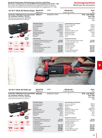 Technische %u00c4nderungen. Preis%u00e4nderungen und Irrtum vorbehalten.Alle Preise verstehen sich als unverbindliche Preisempfehlung exkl. MwSt + vRGSous r%u00e9serve de modifications techniques, de changements de prix et d%u2019erreurs. Tous les prix s%u2018entendent comme prix recommand%u00e9s sans engagement, HT + TAR334Zubeh%u00f6r Metalloberfl%u00e4chen-BearbeitungAccessoires Traitement de surface m%u00e9talliqueGummiluftwalzeCylindre %u00e0 air en caoutchoucRabattcodeCode de remise2Zum gef%u00fchlvollen Schleifen von Konturen. Passend f%u00fcr LP 1503 VR.Pour bien poncer les contours. Pour LP 1503 VR.BezeichnungD%u00e9signationBestell-Nr.R%u00e9f%u00e9renceVEUEPreis PrixAS 90x100256.4151104.%u2013LuftpumpePompe d%u2018airRabattcodeCode de remise2Zum Aufpumpen der Gummiluftrolle.Pour gonfler le rouleau caoutchouc pneumatique.BezeichnungD%u00e9signationBestell-Nr.R%u00e9f%u00e9renceVEUEPreis PrixLUP 225-260 BS256.284116.%u2013ExpansionswalzeRouleau d%u2019expansionRabattcodeCode de remise2Zur Verwendung von Schleif- und Polierh%u00fclsen. Diese werden einfach %u00fcber den Gummitr%u00e4ger geschoben und durch die Fliehkraft sicher gespannt.Pour l%u2019utilisation de manchons %u00e0 poncer et %u00e0 polir. Ces derniers sont simplement pouss%u00e9s par le support en caoutchouc et tendus de mani%u00e8re s%u00fbre sous l%u2019effet de la force centrifuge.BezeichnungD%u00e9signationBestell-Nr.R%u00e9f%u00e9renceVEUEPreis PrixES 100x100433.9261200.%u2013AntriebsrolleRouleau d%u2018entra%u00eenementRabattcodeCode de remise2Mit Edelstahl-Anlaufscheiben. Ben%u00f6tigt wird der Distanzringsatz (Bestell-Nr. 250.522).Poulie de commande avec flasques inoxydables. Le kit %u00e0 bague d%u2018%u00e9cartement est n%u00e9cessaire (R%u00e9f. 250.522).BezeichnungD%u00e9signationBestell-Nr.R%u00e9f%u00e9renceVEUEPreis PrixRA 62x70 INOX303.0541141.%u2013DistanzringsatzJeu de rondelles d%u2018%u00e9cartementRabattcodeCode de remise2Erforderlich f%u00fcr Nylonb%u00fcrste, VA-Drahtb%u00fcrste, Litzendrahtb%u00fcrste, Baumwollschwabbel. Wenn nur 1 Schleifrad montiert werden soll, auch erforderlich f%u00fcr Schleif-Mop, Schleif-Vlies, Schleif-Mop-Vlies, Feinschleifrolle sowie f%u00fcr Schleifr%u00e4der unter 100 mm Breite.N%u00e9cessaire pour brosses nylon, brosses m%u00e9talliques VA, brosses m%u00e9talliques en fils torsad%u00e9s, disques toile en coton. Lorsqu%u2018une seule roue de pon%u00e7age doit %u00eatre mont%u00e9e, n%u00e9cessaire %u00e9galement pour tambour %u00e0 lamelles, toile abrasive, tambour de finition ainsi que pour les roues de pon%u00e7age d%u2018une largeur inf%u00e9rieure %u00e0 100 mm.BezeichnungD%u00e9signationBestell-Nr.R%u00e9f%u00e9renceVEUEPreis PrixDRS-BS250.522111.%u2013Poli-cleanPoli-cleanRabattcodeCode de remise2Hartstruktur-Vliesrad. Zur Reinigung von Schweissn%u00e4hten, porentiefe Entfernung von Rost und Oxidschichten.Roue toile abrasive. Pour nettoyer les soudures, enlever la rouille et les couches oxyd%u00e9es.BezeichnungD%u00e9signationDurchmesserDiam%u00e8treBreiteLargeurBestell-Nr.R%u00e9f%u00e9renceVEUEPreis PrixSW-PC EC 100x100100 mm100 mm257.375199.%u2013