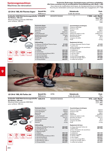 Technische %u00c4nderungen. Preis%u00e4nderungen und Irrtum vorbehalten.Alle Preise verstehen sich als unverbindliche Preisempfehlung exkl. MwSt + vRGSous r%u00e9serve de modifications techniques, de changements de prix et d%u2019erreurs. Tous les prix s%u2018entendent comme prix recommand%u00e9s sans engagement, HT + TAR364Zubeh%u00f6r Metalloberfl%u00e4chen-BearbeitungAccessoires Traitement de surface m%u00e9talliqueSchleif-MopRoues %u00e0 lamellesRabattcodeCode de remise2Elastisches Schleifrad mit einzelnen, flexiblen Schleiflamellen und Keilnut. Zum Entlacken, Verschleifen und kr%u00e4ftigen Strukturieren. Beseitigt Kratzer, Rost, Altfarben, Zunder, Grate. Mit Korn 40 k%u00f6nnen selbst tiefe Kratzer auf Edelstahl beseitigt werden.Roue de pon%u00e7age souple %u00e0 lamelles. Pour enlever les vernis, poncer et structurer avec vigueur. Elimine %u00e9raflures, rouille, peintures, calamine, bavures. Avec le grain 40, on peut supprimer les rayures profondes sur l%u2018inoxydable.BezeichnungD%u00e9signationDurchmesserDiam%u00e8treBreiteLargeurKornGrainBestell-Nr.R%u00e9f%u00e9renceVEUEPreis PrixSW-M P40 100x50100 mm50 mmP 40250.496127.%u2013SW-M P60 100x50100 mm50 mmP 60250.498127.%u2013SW-M P80 100x50100 mm50 mmP 80250.499127.%u2013SW-M P120 100x50100 mm50 mmP 120250.501127.%u2013SW-M P180 100x50100 mm50 mmP 180250.504131.%u2013SW-M P240 100x50100 mm50 mmP 240250.505131.%u2013SW-M P40 100x100100 mm100 mmP 40358.827144.%u2013SW-M P60 100x100100 mm100 mmP 60358.835144.%u2013SW-M P80 100x100100 mm100 mmP 80358.843144.%u2013SW-M P120 100x100100 mm100 mmP 120358.851144.%u2013SW-M P180 100x100100 mm100 mmP 180358.878151.%u2013SW-M P240 100x100100 mm100 mmP 240358.886152.%u2013Schleif-VliesToile abrasiveRabattcodeCode de remise2Elastische Vlieswalze aus schleifkorndurchsetztem Nylongewebe mit Keilnut. Erzielt effektvolle Oberfl%u00e4chen auf Edelstahl, Kupfer, Alu, Messing usw. Auch zum Reinigen von oxidierten Schichten und zum Gl%u00e4tten von Kunststoffen und Holz.Rouleau de toison %u00e9lastique en tissu nylon charg%u00e9 de grains abrasifs. Pour les surfaces inoxydables, cuivre, aluminium, laiton, etc. Egalement pour nettoyer les oxydes m%u00e9talliques et pour satiner plastiques et bois.BezeichnungD%u00e9signationDurchmesserDiam%u00e8treBreiteLargeurKornGrainBestell-Nr.R%u00e9f%u00e9renceVEUEPreis PrixSW-V A80 100x50100 mm50 mmA 80250.509123.%u2013SW-V A160 100x50100 mm50 mmA 160250.510123.%u2013SW-V A280 100x50100 mm50 mmA 280250.512123.%u2013SW-V A400 100x50100 mm50 mmA 400250.513123.%u2013SW-V A80 100x100100 mm100 mmA 80256.973140.%u2013SW-V A180 100x100100 mm100 mmA 180256.974140.%u2013SW-V A280 100x100100 mm100 mmA 280256.975140.%u2013SW-V A400 100x100100 mm100 mmA 400256.976140.%u2013Schleif-Mop-VliesToile abrasiveRabattcodeCode de remise2Elastische Kombination aus Schleifmop und Schleifvlies. Eignet sich zum Mattieren und Satinieren. Beseitigt kleine Kratzer auf Metallen, Hartkunststoffen und Holz.Combinaison souple de lamelles et toiles abrasives. Convient pour mater et satiner. Fait dispara%u00eetre les %u00e9raflures l%u00e9g%u00e8res sur m%u00e9taux, plastiques rigides et bois.BezeichnungD%u00e9signationDurchmesserDiam%u00e8treBreiteLargeurKornGrainBestell-Nr.R%u00e9f%u00e9renceVEUEPreis PrixSW-M/V P80/A160 100x50100 mm50 mmP 80 / A 160250.515124.%u2013SW-M/V P150/A280 100x50100 mm50 mmP 150 / A 280250.516124.%u2013SW-M/V P240/A280 100x50100 mm50 mmP 240 / A 280358.894126.%u2013SW-M/V P80/A160 100x100100 mm100 mmP 80 / A 160256.977143.%u2013SW-M/V P150/A280 100x100100 mm100 mmP 150 / A 280256.978143.%u2013SW-M/V P240/A280 100x100100 mm100 mmP 240 / A 280358.908143.%u2013
