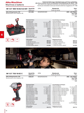 Technische %u00c4nderungen. Preis%u00e4nderungen und Irrtum vorbehalten.Alle Preise verstehen sich als unverbindliche Preisempfehlung exkl. MwSt + vRGSous r%u00e9serve de modifications techniques, de changements de prix et d%u2019erreurs. Tous les prix s%u2018entendent comme prix recommand%u00e9s sans engagement, HT + TAR243GeradschleiferMeuleuses droitesTechnische DatenLeistungsaufnahme710 WLeistungsabgabe420 WSpannung230 VFrequenz50/60 HzLeerlaufdrehzahl2%u2018500 %u2013 6%u2018500 1/minMax. Schleifk%u00f6rperdurchmesser50 mmWerkzeugaufnahmeSpannzangeKabell%u00e4nge4.0 mAbmessung LxBxH340 x 76 x 84 mmGewicht2.1 kgLieferumfang1x Spannzange228.6561x Anhalteklaue, SW 14254.9171x Einmaulschl%u00fcssel, SW 19104.914Caract%u00e9ristiques techniquesPuissance absorb%u00e9e2600 WPuissance utile1800 WTension230 VFr%u00e9quence50/60 HzVitesse de rotation %u00e0 vide2%u2018500 %u2013 6%u2018500 tr/minDiam%u00e8tre max. de la meule50 mmEmmanchementPince de serrageLongueur de c%u00e2ble4.0 mDimension LxlxH340 x 76 x 84 mmPoids2.1 kgEquipement de base1x pince de serrage228.6561x griffe d%u2018arr%u00eat, SW 14254.9171x cl%u00e9 %u00e0 fourche, SW 19104.914H 1105 VEBestell-Nr.R%u00e9f%u00e9renceGTINRabattcodeCode de remisePreisPrix710 Watt GeradschleiferMeuleuse droite 710 Watt269.95640302930772871625.%u2013 exkl. MwSt. hors TVA 0.56 vRGTARTechnische DatenLeistungsaufnahme800 WSpannung230 VFrequenz50/60 HzLeerlaufdrehzahl10%u2018600 %u2013 32%u2018000 1/minMax. Schleifk%u00f6rperdurchmesser50 mmSpannhalsdurchmesser43 mmGreifumfang147 mmWerkzeugaufnahmeSpannzangeKabell%u00e4nge4.0 mAbmessung LxBxH380 x 83 x 83 mmGewicht2.1 kgLieferumfang1x Spannzange530.0141x Gabelschl%u00fcssel, SW 17Caract%u00e9ristiques techniquesPuissance absorb%u00e9e2600 WTension230 VFr%u00e9quence50/60 HzVitesse de rotation %u00e0 vide10%u2018600 %u2013 32%u2018000 tr/minDiam%u00e8tre max. de la meule50 mmDiam%u00e8tre de collier de serrage43 mmCirconf%u00e9rence de pr%u00e9hension147 mmEmmanchementPince de serrageLongueur de c%u00e2ble4.0 mDimension LxlxH380 x 83 x 83 mmPoids2.1 kgEquipement de base1x pince de serrage530.0141x cl%u00e9 %u00e0 fourche simple, SW 17DGE 8-32Bestell-Nr.R%u00e9f%u00e9renceGTINRabattcodeCode de remisePreisPrix800 Watt Geradschleifer mitvariablem, hohem DrehzahlbereichMeuleuse droite 800 Watt %u00e0 haut vitesse522.27940302932403771440.%u2013 exkl. MwSt. hors TVA 0.56 vRGTARSpannzange f%u00fcr / Pince de serrage pour H 1105 / H 1127 VE SpannzangePince de serrageRabattcodeCode de remise2mit Spannmutteravec ecrou de serrageBezeichnungD%u00e9signationDurchmesserDiam%u00e8treBestell-Nr.R%u00e9f%u00e9renceVEUEPreis PrixSPZ-H D33 mm229.741155.%u2013SPZ-H D1/41/4\229.776156.%u2013SPZ-H D66 mm228.656140.%u2013SPZ-H D88 mm229.768155.%u2013Spannzange f%u00fcr / Pince de serrage pour DGESpannzangePince de serrageRabattcodeCode de remise2mit Spannmutter. Passend f%u00fcr Geradschleifer DGE 8-32 und DGE 25 18.0-EC.avec ecrou de serrage. Convient aux meuleuses droites DGE 8-32 et DGE 25 18.0-EC.BezeichnungD%u00e9signationDurchmesserDiam%u00e8treBestell-Nr.R%u00e9f%u00e9renceVEUEPreis PrixSPZ-DGE 066 mm530.014132.%u2013SPZ-DGE 088 mm530.015132.%u2013SPZ-DGE 1/41/4\530.016132.%u2013