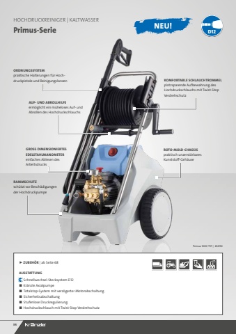 18X 8/150 TST | 603602X-SerieD12HOCHDRUCKREINIGER | KALTWASSERKOMFORTABLE SCHLAUCHTROMMELplatzsparende Aufbewahrung des Hochdruckschlauchs mit Twist-Stop Verdrehschutz AUSSTATTUNGSchnellwechsel-Stecksystem D12%u25a0Kr%u00e4nzle Axialpumpe%u25a0Totalstop-System%u25a0Stufenlose Druckregulierung %u25a0Hochdruckschlauch mit Twist-Stop Verdrehschutz%u25ba ZUBEH%u00d6R Seite 26-27NEU!ZUBEH%u00d6RBOXmit integrierter Halterung f%u00fcr Kr%u00e4nzle Schaumlanze, f%u00fcr praktisches Aufbewahren des Zubeh%u00f6rs4-POLIGER ELEKTROMOTOR 1.400 U/minreduziert die Ger%u00e4uschentwicklungund den Verschlei%u00df (X 8/150 TST)GEL%u00c4NDEG%u00c4NGIGES FAHRWERKrobustes Fahrgestell f%u00fcr leichten Transport und hohe StandsicherheitORDNUNGSSYSTEMpraktische Halterungen f%u00fcr Hochdruckpistole und ReinigungslanzenGROSS DIMENSIONIERTES EDELSTAHLMANOMETER einfaches Ablesen des Arbeitsdrucks