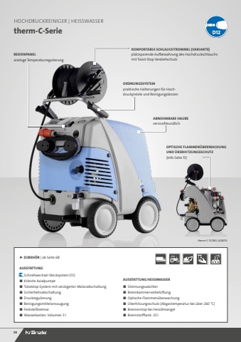 10D12Wer sich f%u00fcr die Marke Kr%u00e4nzle entscheidet, erh%u00e4lt immer ausgereifte Hochdruckreiniger, die auf der ganzen Linie %u00fcberzeugen. In unserem s%u00fcddeutschen Produktionsstandort Illertissen wird jeder Hochdruckreiniger von Hand %u00fcberpr%u00fcft, bevor er das Werk verl%u00e4sst. So garantieren wir Anwendern h%u00f6chste Qualit%u00e4t, souver%u00e4ne Reinigungskraft und besonders lange Lebensdauer.AUF KR%u00c4NZLE IST EINFACH VERLASSQUALIT%u00c4T BIS IN JEDES DETAILLANGSAM LAUFENDER ELEKTROMOTORSparsam, leise und langlebig: Die besonders leistungsstarken Hochdruckreiniger f%u00fcr den Dauerbetrieb sind mit einem 4-poligen Elektromotor ausger%u00fcstet. Seine niedrige Drehzahl von 1400 U/min reduziert den Anlaufstrom, sorgt damit f%u00fcr weniger Verschlei%u00df und senkt die Ger%u00e4uschentwicklung.DRUCKREGULIERUNG | EDELSTAHLMANOMETERBei allen Hochdruckreinigern (Ausnahme K 1050-Serie) k%u00f6nnen Arbeitsdruck und Wassermenge individuell dem jeweiligen Einsatz angepasst werden. Mit dem gro%u00dfdimensionierten Edelstahlmanometer l%u00e4sst sich der eingestellte Arbeitsdruck %u00fcbersichtlich ablesen. Es enth%u00e4lt eine Glycerinfl%u00fcssigkeit, die m%u00f6gliche Schwankungen des Zeigers d%u00e4mpft.SCHNELLWECHSEL-STECKSYSTEM Intelligent und zuverl%u00e4ssig: Das Schnellwechsel-Stecksystem mit geh%u00e4rteten Edelstahlkomponenten sorgt f%u00fcr die einfache und jederzeit sichere Verbindung der Sicherheits-Abschaltpistole mit der Lanze. DIE KR%u00c4NZLE PRODUKTVORTEILE%u25a0hochwertige Materialien und Verarbeitung %u25a0innovatives Design%u25a0anwendungsfreundliches Handling%u25a0umweltbewusster Verbrauch%u25a0extreme LanglebigkeitQualit%u00e4t beginnt f%u00fcr uns bereits bei der Produktentwicklung, die im Standort Illertissen angesiedelt ist. Dort finden auch die Herstellung und Qualit%u00e4tskontrolle fast aller Komponenten statt. QUALIT%u00c4T %u201eMADE IN GERMANY%u201c SECHSKANT VERDREHSICHERUNGReinigungslanzen und Zubeh%u00f6r, die mit einer Sechskant-Kupplung ausgestattet sind, k%u00f6nnen in sechs verschiedenen Positionen verdrehsicher arretiert werden. Dadurch verdreht sich das Zubeh%u00f6r nicht ungewollt und l%u00e4sst sich durch das Bewegen der Pistole f%u00fchren.