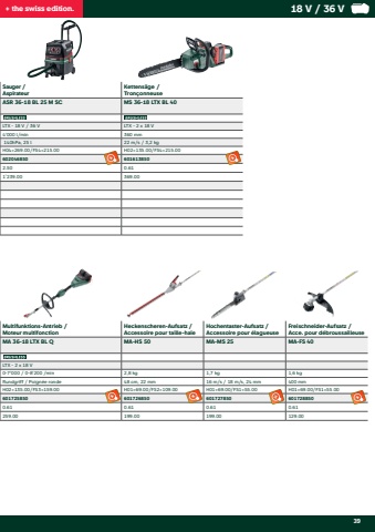Sauger / AspirateurSauger / AspirateurSauger / AspirateurSauger / AspirateurAS 36-18 L 30 PC CC AS 36-18 M 30 PC CC AS 36-18 H 30 PC CCASR 36-18 BL 25 M SCCordlessControlCordlessControlCordlessControl30 l, Klasse / classe L30 l, Klasse / classe M30 l, Klasse / classe H25 l, Klasse / classe M3'300 l/min, 140 hPa (mbar)3'300 l/min, 140 hPa (mbar)3'300 l/min, 140 hPa (mbar)Nass-/Trockensauger / eau/poussi%u00e8reH02=135.00/FS4=215.00H03=189.00/FS4=215.00H03=189.00/FS4=215.00H04=269.00/FS4=215.006020738506020748506020758506020468502.502.502.502.50479.00559.00639.001%u2019239.00Schlagschrauber / Visseuse %u00e0 chocSchlagschrauber / Visseuse %u00e0 chocSchlagschrauber / Visseuse %u00e0 chocSchlagschrauber / Visseuse %u00e0 chocSSW 18 LTX 400 BLSSW 18 LTX 800 BLSSW 18 LTX 1450 BLSSW 18 LTX 1750 BLLTXLTXLTXLTX400 Nm800 Nm1'450 Nm1'750 Nm1/2\1/2\3/4\3/4\H02=135.00/FS4=215.00H02=135.00/FS3=159.00H02=135.00/FS4=215.00H02=135.00/FS4=215.006022058906024038506024018506024028500.610.610.610.61315.00365.00435.00465.006022058406024038406024018406024028400.610.610.610.61329.00389.00459.00489.006022055002.33529.006022058002.33589.006024036606024016606024026602.332.332.33659.00739.00769.00Sauger / AspirateurSauger / AspirateurAS 18 L PCAS 18 L PC + Rollbrett7.5 l, Klasse / classe L7.5 l, Klasse / classe L2%u2018100l/min, 120hPa2%u2018100l/min, 120hPaH02=135.00/FS4=215.00H01=69.00/Keine6020218506910600000.610.61249.00309.0023+ the swiss edition.18 V