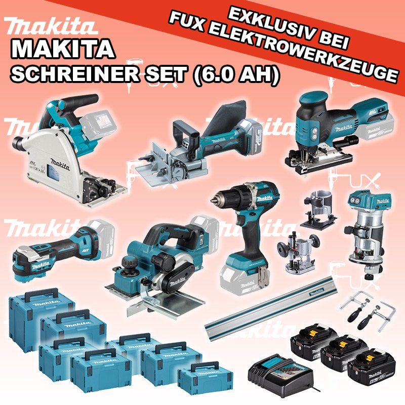Das Ladenlokal bleibt vom 25. Dezember 2025 bis am 04. Januar 2026 geschlossen. Bestellungen und Lieferungen von Neugeräten werden trotz Ferienabwesenheit in gewohnter Fux-Manier entgegengenommen und ausgeliefert. Heute auf dieses Produkt 31% Rabatt! Zu "Schreiner Set" von Makita Sparfux Aktionen FUX SPECIAL EXKLUSIV BEI FUX Makita Schreiner Set 7 (6.0 Ah) Bestell- und Artikelnummer: maSchreiner Set 7 (6.0 Ah) DSP601ZJU Eintauch-KreissägeAkkuspannung 2 x 18 V Sägeblatt (Ø) 165 mm Schnitttiefe bei 90° 56 mm Gewicht (EPTA) 5.1 kg Infos DTM52Z Multifunktions WerkzeugAkkuspannung 18 V Schwingungen 10000 - 20000 min-1 Werkzeugaufnahme Starlock Max System Gewicht inkl. Akku 2.0 kg Infos DJV18ZJ Akku-StichsägeAkkuspannung 18 V Hubzahl 800 - 3500/ min Schnittleistung Holz 135 mm / Stahl 10 mm Gewicht 2.5 kgInfos DRT50ZJX11 Akku-Einhandfräse / Kantenfräse Akkuspannung 18 V Leerlaufdrehzahl 10000 - 30000 min-1 Tiefeneinstellung bis 40 mm Gewicht 2.0 kgInfos DDF484ZJ Akku-BohrschrauberAkkuspannung 18 V Drehzahlen 0-500 / 0-2000 U/min Drehmoment hart / weich 54 / 30 Nm Gewicht 1.5 kgInfos DKP181ZJ Akku-Einhand-HobelAkkuspannung 18 V Hobelbreite 82 mm Spanabnahme stufenlos 0 - 3 mm Gewicht inkl. Akku 3.6 kgInfos DPJ180ZJ Akku-Universal-NutfräseAkkuspannung 18 V Leerlaufdrehzahl 6500 min-1 Fräserdurchmesser 100 mm Gewicht inkl. Akku 3.3 kgInfos 3 x BL 1860 B ( Li-Ion Akku )18 V 6.0 Ah ( Li-Ion Akku ) Infos DC 18 RC Schnell-Ladegerätfür Akkus 14.4 - 18 Volt ( Li-Ion Akkus )Infos Führungsschiene L = 140 cmgeeignet für SP6000 Handkreissäge mit passenden Adapter Auch für weitere Handkreissägen und Stichsägen geeignet mit passendem Adapter. ( 194579-2 )Infos 194385-5 Schraubzwingen für Führungsschienen2 Schraubzwingen für FührungsschienenInfos MAKPAC Gr. 3Produktabmessung (L x B x H) 377 x 277 x 176 mm Infos Einsatz für DTM52 Einsatz für DTM52 Makpac Koffer Typ C (821551-8) Infos Standard-Ausrüstung In diesem Set enthalten: DSP601ZJU Eintauch-Kreissäge DTM52Z Multifunktions Werkzeug DJV18ZJ Akku-Stichsäge DRT50ZJX11 Akku-Einhandfräse / Kantenfräse DDF484ZJ Akku-Bohrschrauber DKP181ZJ Akku-Einhand-Hobel DPJ180ZJ Akku-Universal-Nutfräse 3 x BL 1860 B ( Li-Ion Akku ) DC 18 RC Schnell-Ladegerät Führungsschiene L = 140 cm 194385-5 Schraubzwingen für Führungsschienen MAKPAC Gr. 3 Einsatz für DTM52 Geliefert im Koffer Zubehör Listenpreis CHF 3'343.00 Fuxpreis CHF 2'293.00 inkl. 8.1% MwSt, inkl vRG Versand CHF 20.00 Kein Grauimport! Produkt bestellen 1 Stück 2 Stück 3 Stück 4 Stück 5 Stück 6 Stück 7 Stück 8 Stück 9 Stück 10 Stück Option: Makita BL 1860 B ( Li-lon Akku ) für CHF 95.- statt CHF 124.-Infos Alle Angaben ohne Gewähr und solange Vorrat reicht!Wiederverkäufer werden? Produkt als PDF NEUHEITAKTION 31%