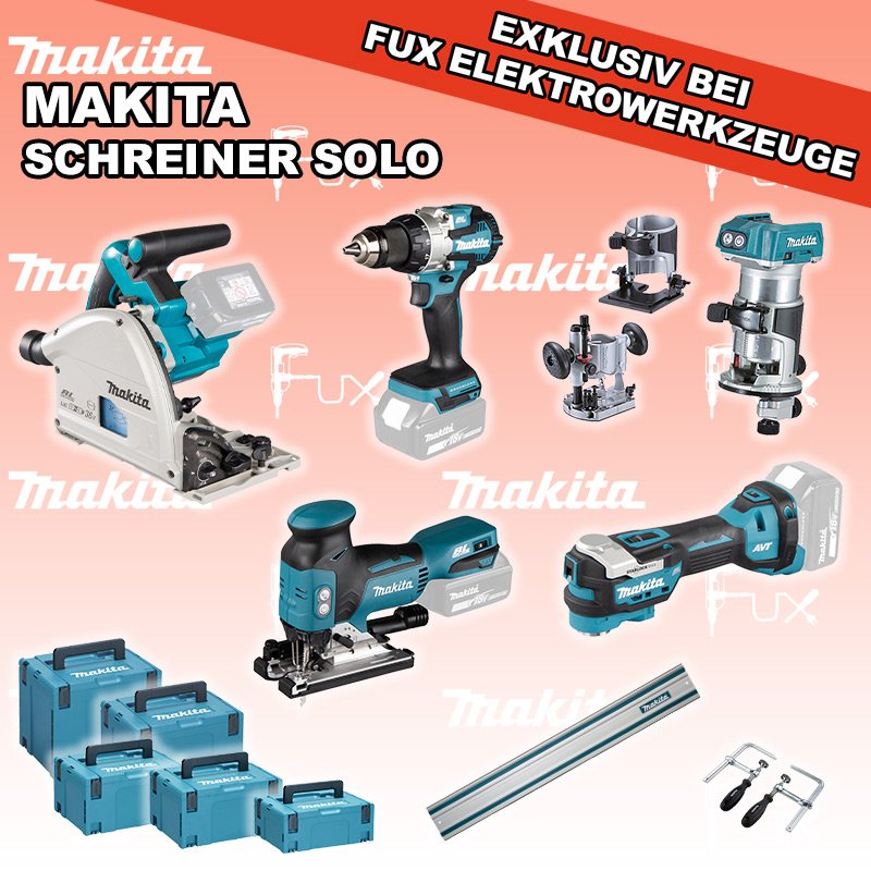 Das Ladenlokal bleibt vom 25. Dezember 2025 bis am 04. Januar 2026 geschlossen. Bestellungen und Lieferungen von Neugeräten werden trotz Ferienabwesenheit in gewohnter Fux-Manier entgegengenommen und ausgeliefert. Heute auf dieses Produkt 35% Rabatt! Zu "Schreiner Set" von Makita Sparfux Aktionen FUX SPECIAL EXKLUSIV BEI FUX Makita Schreiner Set 5 SOLO Bestell- und Artikelnummer: maSchreiner Set 5 SOLO DSP600ZJ Eintauch-KreissägeAkkuspannung 2 x 18 V Sägeblatt (Ø) 165 mm Schnitttiefe bei 90° 56 mm Gewicht 5.1 kg Infos DTM52Z Multifunktions WerkzeugAkkuspannung 18 V Schwingungen 10000 - 20000 min-1 Werkzeugaufnahme Starlock Max System Gewicht inkl. Akku 2.0 kg Infos DRT50ZJX11 Akku-Einhandfräse / Kantenfräse Akkuspannung 18 V Leerlaufdrehzahl 10000 - 30000 min-1 Tiefeneinstellung bis 40 mm Gewicht 2.0 kgInfos DJV18ZJ Akku-StichsägeAkkuspannung 18 V Hubzahl 800 - 3500/ min Schnittleistung Holz 135 mm / Stahl 10 mm Gewicht 2.5 kgInfos DDF489Z Akku-BohrschrauberAkkuspannung 18 V Leerlaufdrehzahl 0 - 500 / 1800 U/min Drehmoment hart / weich 70 / 40 Nm Gewicht inkl. Akku 1.8 - 2.5 kgInfos Führungsschiene L = 140 cmgeeignet für SP6000 Handkreissäge mit passenden Adapter Auch für weitere Handkreissägen und Stichsägen geeignet mit passendem Adapter. ( 194579-2 )Infos 194385-5 Schraubzwingen für Führungsschienen2 Schraubzwingen für FührungsschienenInfos MAKPAC Gr. 2Produktabmessung (L x B x H) 395 x 295 x 163 mm Infos MAKPAC Gr. 3Produktabmessung (L x B x H) 377 x 277 x 176 mm Infos Einsatz für DTM52 Einsatz für DTM52 Makpac Koffer Typ C (821551-8) Infos Einsatz für diverse Akkuschrauber Einsatz für DDF343ZJ, DDF441, DDF446, DDF448, DDF451, DDF453, DDF456R, DDF458, DDF459, DDF480, DDF481, DDF482, DDF484, DDF485, DDF486, DHP441, DHP446, DHP448, DHP451, DHP456, DHP458, DHP459, DHP470, DHP480, DHP481, DHP482, DHP484, DHP485, DHP486, DLX2126TJ1, DLX3092TJInfos OHNE AKKUS UND LADEGERÄT Standard-Ausrüstung In diesem Set enthalten: DSP600ZJ Eintauch-Kreissäge DTM52Z Multifunktions Werkzeug DRT50ZJX11 Akku-Einhandfräse / Kantenfräse DJV18ZJ Akku-Stichsäge DDF489Z Akku-Bohrschrauber Führungsschiene L = 140 cm 194385-5 Schraubzwingen für Führungsschienen MAKPAC Gr. 2 MAKPAC Gr. 3 Einsatz für DTM52 Einsatz für diverse Akkuschrauber Geliefert im Koffer Zubehör Listenpreis CHF 2'135.00 Fuxpreis CHF 1'384.00 inkl. 8.1% MwSt, inkl vRG Versand CHF 20.00 Kein Grauimport! Produkt bestellen 1 Stück 2 Stück 3 Stück 4 Stück 5 Stück 6 Stück 7 Stück 8 Stück 9 Stück 10 Stück Option: Makita BL 1860 B ( Li-lon Akku ) für CHF 95.- statt CHF 124.-Infos Alle Angaben ohne Gewähr und solange Vorrat reicht!Wiederverkäufer werden? Produkt als PDF NEUHEITAKTION 35%