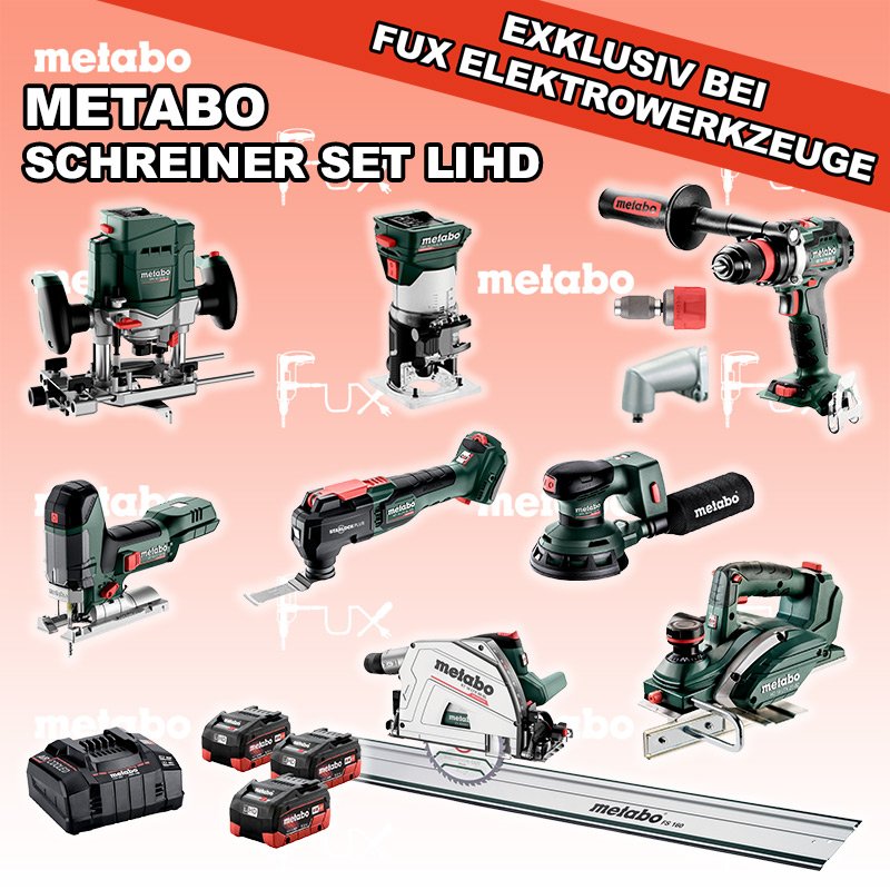 Heute auf dieses Produkt 40% Rabatt! Zu "Schreiner Set" von Metabo FULL Service: 36 Monate zum Nulltarif für Sie! Weitere Infos zum FULL Service Dieses Produkt ist CAS kompatibel! Weitere Infos zu CAS Sparfux Aktionen FUX SPECIAL EXKLUSIV BEI FUX Metabo Schreiner Set XXL 3 LiHD Bestell- und Artikelnummer: Schreiner Set XXL 3 LiHD ST 18 LT 130 BL Akku-StichsägeAkkuspannung 18 V Hubzahl 1000-3.500 /min Gewicht ohne Akkupack 1.5 kgInfos BS 18 LTX BL Q I Akku-BohrschrauberAkkuspannung 18 V Drehzahl 0-550 / 0-2000 U/min Drehmoment hart / weich 130 / 65 Nm Gewicht (mit Akkupack) 2.3 kgInfos FMV 18 LTX BL 8 Akku Kantenfräse Akkuspannung 18 V Leerlaufdrehzahl 4.800 - 29.000 /min Spannbohrung der Spannzange 6 / 8 mmInfos OFV 18 LTX BL 12 Akku-OberfräseAkkuspannung 18 V Leerlaufdrehzahl 11.000 - 25.000 / min Spannbohrung der Spannzange 6 / 8 / 12 mm Gewicht ohne Akkupack 2.900 gInfos KT 18 LTX 66 BL Akku TauchkreissägeAkkuspannung 18 V Schnitt-Tiefe bei 90° 0-66 mm Sägeblatt 165 mm Gewicht 5.3 kgInfos HO 18 LTX 20-82 Akku-Einhand-HobelAkkuspannung 18 V Hobelbreite 82 mm Spanabnahme einstellbar 0-2 mm Gewicht 3.5 KgInfos MT 18 LTX BL QSL Akku-Multitool Akkuspannung 18 V Schwingzahl bei Leerlauf 8.000 - 20.000 /min Schleifplatte, Maß Eck zu Eck 93 mm Gewicht 1.7 kgInfos SXA 18 LTX 125 BL Exzenterschleifer Akkuspannung 18 V Durchmesser des Stütztellers 125 mm Leerlaufdrehzahl 4000 - 10000 /min Gewicht (mit Akkupack) 1.7 kg Infos FS 160 FührungsschieneGesamtlänge 1600 mmInfos 3 x 18 V, 5.5 Ah, LiHD Akkupack18 V 5.5 Ah ( LiHD Akkus ) Infos ASC 145, 12 - 36 V "Air Cooled" LadegerätZum Aufladen aller Li-Power Schiebesitz-Akkupacks (12 V - 36 V). Ladestrom 8.0 AInfos Schnellwechselbithalter »Quick«Schnellwechselbithalter »Quick« Geeignet für alle Metabo "Quick" Maschinen Bits mit 1/4 "Außensechskantantrieb Infos Schnellwechselwinkeladapter »Quick«Metabo "Quick" Maschinen mit Spannzange Ø 43 mm Magnetischer Bithalter mit 1/4 "(6,35 mm) SechskantschaftInfos Registriere die in diesem Set vorhandenen Metabo Maschinen auf metabo.ch, und ergattere dir bis zu 5 Gratis Akkus!Zusätzlich offerieren wir zu diesem Set einen Gratis Akku! Standard-Ausrüstung In diesem Set enthalten: ST 18 LT 130 BL Akku-Stichsäge BS 18 LTX BL Q I Akku-Bohrschrauber FMV 18 LTX BL 8 Akku Kantenfräse OFV 18 LTX BL 12 Akku-Oberfräse KT 18 LTX 66 BL Akku Tauchkreissäge HO 18 LTX 20-82 Akku-Einhand-Hobel MT 18 LTX BL QSL Akku-Multitool SXA 18 LTX 125 BL Exzenterschleifer FS 160 Führungsschiene 3 x 18 V, 5.5 Ah, LiHD Akkupack ASC 145, 12 - 36 V "Air Cooled" Ladegerät Schnellwechselbithalter »Quick« Schnellwechselwinkeladapter »Quick« Zubehör Verbrauchsmaterial Listenpreis CHF 3'598.50 Fuxpreis CHF 2'159.00 inkl. 8.1% MwSt, inkl vRG Versand CHF 40.00 Kein Grauimport! Produkt bestellen 1 Stück 2 Stück 3 Stück 4 Stück 5 Stück 6 Stück 7 Stück 8 Stück 9 Stück 10 Stück Alle Angaben ohne Gewähr und solange Vorrat reicht!Wiederverkäufer werden? Produkt als PDFVideo LiHD 1Video LiHD 2 AKTION 40%