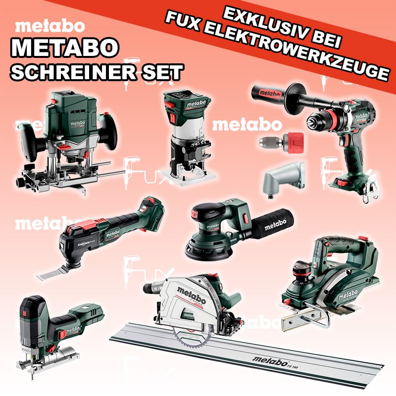 Heute auf dieses Produkt 40% Rabatt! Zu "Schreiner Set" von Metabo FULL Service: 36 Monate zum Nulltarif für Sie! Weitere Infos zum FULL Service Dieses Produkt ist CAS kompatibel! Weitere Infos zu CAS Sparfux Aktionen FUX SPECIAL EXKLUSIV BEI FUX Metabo Schreiner Set XXL 2 SOLO Bestell- und Artikelnummer: Schreiner Set XXL 2 SOLO ST 18 LT 130 BL Akku-StichsägeAkkuspannung 18 V Hubzahl 1000-3.500 /min Gewicht ohne Akkupack 1.5 kgInfos BS 18 LTX BL Q I Akku-BohrschrauberAkkuspannung 18 V Drehzahl 0-550 / 0-2000 U/min Drehmoment hart / weich 130 / 65 Nm Gewicht (mit Akkupack) 2.3 kgInfos FMV 18 LTX BL 8 Akku Kantenfräse Akkuspannung 18 V Leerlaufdrehzahl 4.800 - 29.000 /min Spannbohrung der Spannzange 6 / 8 mmInfos OFV 18 LTX BL 12 Akku-OberfräseAkkuspannung 18 V Leerlaufdrehzahl 11.000 - 25.000 / min Spannbohrung der Spannzange 6 / 8 / 12 mm Gewicht ohne Akkupack 2.900 gInfos KT 18 LTX 66 BL Akku TauchkreissägeAkkuspannung 18 V Schnitt-Tiefe bei 90° 0-66 mm Sägeblatt 165 mm Gewicht 5.3 kgInfos HO 18 LTX 20-82 Akku-Einhand-HobelAkkuspannung 18 V Hobelbreite 82 mm Spanabnahme einstellbar 0-2 mm Gewicht 3.5 KgInfos MT 18 LTX BL QSL Akku-Multitool Akkuspannung 18 V Schwingzahl bei Leerlauf 8.000 - 20.000 /min Schleifplatte, Maß Eck zu Eck 93 mm Gewicht 1.7 kgInfos SXA 18 LTX 125 BL Exzenterschleifer Akkuspannung 18 V Durchmesser des Stütztellers 125 mm Leerlaufdrehzahl 4000 - 10000 /min Gewicht (mit Akkupack) 1.7 kg Infos FS 160 FührungsschieneGesamtlänge 1600 mmInfos Schnellwechselbithalter »Quick«Schnellwechselbithalter »Quick« Geeignet für alle Metabo "Quick" Maschinen Bits mit 1/4 "Außensechskantantrieb Infos Schnellwechselwinkeladapter »Quick«Metabo "Quick" Maschinen mit Spannzange Ø 43 mm Magnetischer Bithalter mit 1/4 "(6,35 mm) SechskantschaftInfos Registriere die in diesem Set vorhandenen Metabo Maschinen auf metabo.ch, und ergattere dir bis zu 5 Gratis Akkus!Zusätzlich offerieren wir zu diesem Set einen Gratis Akku!OHNE AKKUS UND LADEGERÄT Standard-Ausrüstung In diesem Set enthalten: ST 18 LT 130 BL Akku-Stichsäge BS 18 LTX BL Q I Akku-Bohrschrauber FMV 18 LTX BL 8 Akku Kantenfräse OFV 18 LTX BL 12 Akku-Oberfräse KT 18 LTX 66 BL Akku Tauchkreissäge HO 18 LTX 20-82 Akku-Einhand-Hobel MT 18 LTX BL QSL Akku-Multitool SXA 18 LTX 125 BL Exzenterschleifer FS 160 Führungsschiene Schnellwechselbithalter »Quick« Schnellwechselwinkeladapter »Quick« Zubehör Verbrauchsmaterial Listenpreis CHF 3'126.50 Fuxpreis CHF 1'876.00 inkl. 8.1% MwSt, inkl vRG Versand CHF 40.00 Kein Grauimport! Produkt bestellen 1 Stück 2 Stück 3 Stück 4 Stück 5 Stück 6 Stück 7 Stück 8 Stück 9 Stück 10 Stück Alle Angaben ohne Gewähr und solange Vorrat reicht!Wiederverkäufer werden? Produkt als PDFVideo LiHD 1Video LiHD 2 AKTION 40%