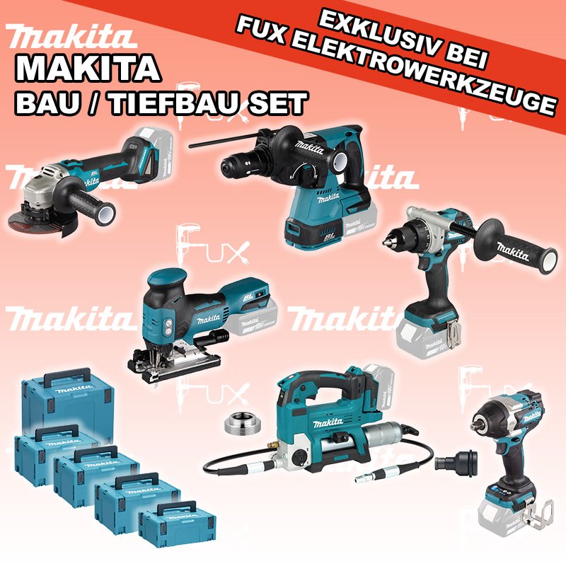 Das Ladenlokal bleibt vom 25. Dezember 2025 bis am 04. Januar 2026 geschlossen. Bestellungen und Lieferungen von Neugeräten werden trotz Ferienabwesenheit in gewohnter Fux-Manier entgegengenommen und ausgeliefert. Zu "Bau / Tiefbau Set" von Makita FUX SPECIAL EXKLUSIV BEI FUX Makita Bau / Tiefbau Set 4 SOLO Bestell- und Artikelnummer: maBau / Tiefbau Set 4 SOLO DDF492Z Akku-BohrschrauberAkkuspannung 18 V Leerlaufdrehzahl 0 - 550 / 0 - 2100 min⁻¹ Drehmoment hart / weich 130 / 65 Nm Gewicht inkl. Akku 2.3 - 2.6 kgInfos DJV18ZJ Akku-StichsägeAkkuspannung 18 V Hubzahl 800 - 3500/ min Schnittleistung Holz 135 mm / Stahl 10 mm Gewicht 2.5 kgInfos DHR243ZJ Akku-BohrhammerAkkuspannung 18 V Einzelschlagstärke 2.0 J ( EPTA ) Bohrleistung in Beton 24 mm Gewicht 3.4 kgInfos DGA506ZJ Akku-WinkelschleiferAkkuspannung 18 V Drehzahl 9000 U / min Scheibendurchmesser 125 mm Gewicht 2,5 kgInfos DTW700Z Akku-SchlagschrauberAkkuspannung 18 V Anziehdrehmoment 700 Nm Werkzeugaufnahme 1/2" Gewicht inkl. Akku 2.7 kgInfos DGP180Z Akku-FettpresseAkkuspannung 18 V Maximaler Druck 690 bar Auspressgeschwindigkeit 145 / 290 ml/min Gewicht inkl. Akku 6.1 kgInfos Reduktions Adapter 1/2" auf 1/4" Aufnahme Max. 350 Nm Länge 45 mmInfos Adapter für Lube-Shuttle® 400GAdapter zum Umrüsten von Fettbehälter auf Lube-Shuttle®* Kartusche 400g geeignet für FP 18 LTXInfos MAKPAC Gr. 2Produktabmessung (L x B x H) 395 x 295 x 163 mm Infos MAKPAC Gr. 3Produktabmessung (L x B x H) 377 x 277 x 176 mm Infos Einsatz für diverse Akkuschrauber Einsatz für DDF343ZJ, DDF441, DDF446, DDF448, DDF451, DDF453, DDF456R, DDF458, DDF459, DDF480, DDF481, DDF482, DDF484, DDF485, DDF486, DHP441, DHP446, DHP448, DHP451, DHP456, DHP458, DHP459, DHP470, DHP480, DHP481, DHP482, DHP484, DHP485, DHP486, DLX2126TJ1, DLX3092TJInfos Einsatz für DTW1001 / DTW1002 / DTW450Einsatz für DTW1001 / DTW1002 / DTW450 Makpac Koffer Typ C (821551-8) Infos OHNE AKKUS UND LADEGERÄT Standard-Ausrüstung In diesem Set enthalten: DDF492Z Akku-Bohrschrauber DJV18ZJ Akku-Stichsäge DHR243ZJ Akku-Bohrhammer DGA506ZJ Akku-Winkelschleifer DTW700Z Akku-Schlagschrauber DGP180Z Akku-Fettpresse Reduktions Adapter Adapter für Lube-Shuttle® 400G MAKPAC Gr. 2 MAKPAC Gr. 3 Einsatz für diverse Akkuschrauber Einsatz für DTW1001 / DTW1002 / DTW450 Geliefert im KofferDGP180Z Akku-Fettpresse ohne Koffer Zubehör Listenpreis CHF 2'210.00 Fuxpreis CHF 1'503.00 inkl. 8.1% MwSt, inkl vRG Versand CHF 20.00 Kein Grauimport! Produkt bestellen 1 Stück 2 Stück 3 Stück 4 Stück 5 Stück 6 Stück 7 Stück 8 Stück 9 Stück 10 Stück Option: Makita BL 1860 B ( Li-lon Akku ) für CHF 95.- statt CHF 124.-Infos Alle Angaben ohne Gewähr und solange Vorrat reicht!Wiederverkäufer werden? Produkt als PDF NEUHEITAKTION 32%