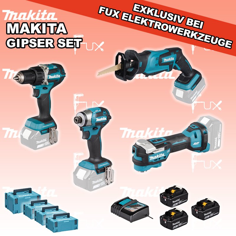 Das Ladenlokal bleibt vom 25. Dezember 2025 bis am 04. Januar 2026 geschlossen. Bestellungen und Lieferungen von Neugeräten werden trotz Ferienabwesenheit in gewohnter Fux-Manier entgegengenommen und ausgeliefert. Zu "Gipser Set" von Makita FUX SPECIAL EXKLUSIV BEI FUX Makita Gipser Set 5 Bestell- und Artikelnummer: maGipser Set 5 DDF484ZJ Akku-BohrschrauberAkkuspannung 18 V Drehzahlen 0-500 / 0-2000 U/min Drehmoment hart / weich 54 / 30 Nm Gewicht 1.5 kgInfos DTD173Z Akku-SchlagschrauberAkkuspannung 18 V Anziehdrehmoment 20 / 50 / 170 / 180 Nm Werkzeugaufnahme 1/4" (Innensechskant) Gewicht inkl. Akku 1.2 - 1.5 kgInfos DTM52Z Multifunktions WerkzeugAkkuspannung 18 V Schwingungen 10000 - 20000 min-1 Werkzeugaufnahme Starlock Max System Gewicht inkl. Akku 2.0 kg Infos DJR183Z Akku-SäbelsägeAkkuspannung 18 V Hubzahl 0-3000 / min Schnittleistung Holz 50 mm / Rohre 50 mm Gewicht 1.6 kgInfos 3 x BL 1860 B ( Li-Ion Akku )18 V 6.0 Ah ( Li-Ion Akku ) Infos DC 18 RC Schnell-Ladegerätfür Akkus 14.4 - 18 Volt ( Li-Ion Akkus )Infos MAKPAC Gr. 3Produktabmessung (L x B x H) 377 x 277 x 176 mm Infos Einsatz für DTM52 Einsatz für DTM52 Makpac Koffer Typ C (821551-8) Infos 2 x MAKPAC Gr. 2Produktabmessung (L x B x H) 395 x 295 x 163 mm Infos Einsatz für diverse Schlagschrauber Einsatz für DDF083, DDF483, DHP483, DTD134, DTD137, DTD146, DTD148, DTD152, DTD153, DTD154, DTD155, DTD170, DTD171, DTP131, DTP141, DTS130, DTS131, DTS141, DTW180, DTW181, DTW250, DTW251, DTW284, DTW285Infos Einsatz für DJR183 Einsatz für DJR183 Makpac Koffer Typ B (821550-0)Infos Standard-Ausrüstung In diesem Set enthalten: DDF484ZJ Akku-Bohrschrauber DTD173Z Akku-Schlagschrauber DTM52Z Multifunktions Werkzeug DJR183Z Akku-Säbelsäge 3 x BL 1860 B ( Li-Ion Akku ) DC 18 RC Schnell-Ladegerät MAKPAC Gr. 3 Einsatz für DTM52 2 x MAKPAC Gr. 2 Einsatz für diverse Schlagschrauber Einsatz für DJR183 Geliefert im Koffer Zubehör Listenpreis CHF 1'650.00 Fuxpreis CHF 1'117.00 inkl. 8.1% MwSt, inkl vRG Versand CHF 20.00 Kein Grauimport! Produkt bestellen 1 Stück 2 Stück 3 Stück 4 Stück 5 Stück 6 Stück 7 Stück 8 Stück 9 Stück 10 Stück Option: Makita BL 1860 B ( Li-lon Akku ) für CHF 95.- statt CHF 124.-Infos Alle Angaben ohne Gewähr und solange Vorrat reicht!Wiederverkäufer werden? Produkt als PDF NEUHEITAKTION 32%