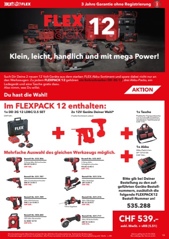 Die Ausstattung der Maschinen entspricht der %u00fcblichen Grundausstattung. Technische %u00c4nderungen, Preis%u00e4nderungen und Irrtum vorbehalten. Alle Preise verstehen sich als unverbindliche Preisempfehlung exkl. MwSt. + vRB. 15 Aktion g%u00fcltig bis 31.03.2026Nur solange der Vorrat reicht3 Jahre Garantie ohne RegistrierungSuch Dir Deine 2 neuen 12 Volt Ger%u00e4te aus dem starken FLEX Akku-Sortiment und spare dabei nicht nur an den Werkzeugen: Zu jedem FLEXPACK 12 geh%u00f6ren ein Bohrschrauber DD 2G 12, drei Akku-Packs, ein Ladeger%u00e4t und eine Tasche gratis dazu.Also nimm, was Du willst.Du hast die Wahl!Klein, leicht, handlich und mit mega Power!Im FLEXPACK 12 enthalten:Mehrfache Auswahl des gleichen Werkzeugs m%u00f6glich.CHF 539.%u2013exkl. MwSt. + vRB (5.51)Bestell-Nr. 533.8462-Gang Akku-BohrschrauberDD 2G 12-EC CCHF 165.%u20132x 12V Ger%u00e4te Deiner Wahl*(*siehe Sortiment unten)1x DD 2G 12 LDBC/2.5 SETCHF169.%u20131x TaschePraktische Transporttascheaus kunststoffverst%u00e4rktem, reissfestem TextillmaterialCHF 119.%u20131x AkkuAkku-Pack Li-Ion AP 12/5.0 AhCHF 106.%u2013Bestell-Nr. 531.707Akku-TrockenbauschrauberDW 37 12-EC CCHF 190.%u2013Bestell-Nr. 531.709Akku-BohrhammerFHE 1-16 12-EC CCHF 225.%u2013Bestell-Nr. 504.602LED Akku-BaustrahlerCL 5000 12/18CHF 215.%u2013Bestell-Nr. 533.8472-Gang AkkuSchlagbohrschrauberPD 2G 12-EC CCHF 175.%u2013Bestell-Nr. 531.316Akku-Stichs%u00e4geJSP 12-EC CCHF 190.%u2013Bestell-Nr. 531.314Akku-S%u00e4bels%u00e4geRS 16 12-EC CCHF 190.%u2013Bestell-Nr. 531.717Akku-WinkelschleiferLBE 76 12-EC CCHF 215.%u2013Bitte gib bei Deiner Bestellung zu den aufgef%u00fchrten Ger%u00e4te-Bestellnummern, zus%u00e4tzlich die folgende FLEXPACK12 Bestell-Nummer an!*ohne S%u00e4geblatt 535.288