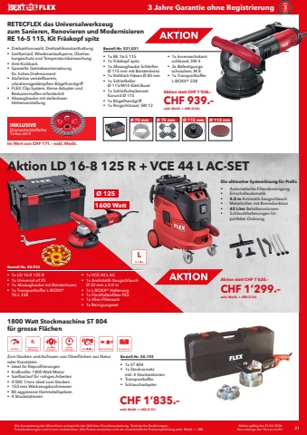 Die Ausstattung der Maschinen entspricht der %u00fcblichen Grundausstattung. Technische %u00c4nderungen, Preis%u00e4nderungen und Irrtum vorbehalten. Alle Preise verstehen sich als unverbindliche Preisempfehlung exkl. MwSt. + vRB. 21 Aktion g%u00fcltig bis 31.03.2026Nur solange der Vorrat reicht3 Jahre Garantie ohne RegistrierungAktion LD 16-8 125 R + VCE 44 L AC-SET%u00d8 125Bestell-Nr. 50.932%u0083 1x LD 16-8 125 R%u0083 1x Universal %u00f8125%u0083 1x Absaughaube mit B%u00fcrstenkranz%u0083 1x Transportkoffer L-BOXX%u00ae TK-L 238 %u0083 1x VCE 44 L AC%u0083 1x Anstistatik-Saugschlauch %u00d8 32 mm x 4.0 m%u0083 1x L-BOXX%u00ae Halterung%u0083 1x Flachfaltenfilter PES %u0083 1x Vlies-Filtersack%u0083 1x Reinigungsset1600 Watt%u0083 Automatische Filterabreinigung%u0083 Einschaltautomatik %u0083 4.0 m Antistatik-Saugschlauch%u0083 Metallrollen mit Bremsfunktion%u0083 42 Liter Beh%u00e4ltervolumen%u0083 Schlauchhalterungen f%u00fcr perfekte OrdnungDie ultimative Systeml%u00f6sung f%u00fcr ProfisAktion statt CHF 1%u2019620.%u2013CHF 1%u2019299.%u2013exkl. MwSt. + vRB (5.56)1800 Watt Stockmaschine ST 804f%u00fcr grosse Fl%u00e4chenZum Stocken und Aufrauen von Oberfl%u00e4chen aus Natur oder Kunststein.%u0083 Ideal f%u00fcr Reprofilierungen%u0083 Kraftvoller 1800 Watt Motor%u0083 Sanftanlauf f%u00fcr ruhiges Arbeiten%u0083 4%u2018000 1/min ideal zum Stocken%u0083 150 mm Werkzeugdurchmesser %u0083 80 aggressive Hartmetallspitzen %u0083 4 StockstationenBestell-Nr. 50.192%u0083 1x ST 804%u0083 1x Stockvorsatzinkl. 4 Stockstationen%u0083 Transportkoffer%u0083 SchlauchadapterCHF 1%u2019835.%u2013exkl. MwSt. + vRB (2.31)Bestell-Nr. 531.031%u0083 1x RE 16-5 115%u0083 1x Fr%u00e4skopf spitz%u0083 1x Absaughaube Schleifen %u00d8 115 mm mit B%u00fcrstenkranz%u0083 1x Stelltisch Fr%u00e4sen %u00d8 80 mm%u0083 1x Schleifteller %u00d8 115/M14 Klett Bowl%u0083 1x Schleifscheibenset Korund %u00d8 115%u0083 1x B%u00fcgelhandgriff%u0083 1x Ringschl%u00fcssel, SW 13%u0083 1x Innensechskantschl%u00fcssel, SW 4%u0083 3x Befestigungsschrauben, M 8%u0083 1x Transportkoffer L-BOXX%u00ae 238%u0083 Drehzahlvorwahl, Drehzahlkonstanthaltung%u0083 Sanftanlauf, Wiederanlaufsperre, %u00dcberlastungsschutz und Temperatur%u00fcberwachung%u0083 Anti-Kickback%u0083 Spezielle Getriebeuntersetzung f%u00fcr hohes Drehmoment%u0083 Stufenlos verstellbarem, vibrationsged%u00e4mpften B%u00fcgelhandgriff%u0083 FLEX Clip-System. Keine Adapter und Reduziermuffen erforderlich%u0083 Absaughaube mit stufenloser H%u00f6henverstellungRETECFLEX das Universalwerkzeug zum Sanieren, Renovieren und Modernisieren RE 16-5 115, Kit Fr%u00e4skopf spitz%u00d8 75 mm %u00d8 75 mm %u00d8 115 mm %u00d8 115 mmINKLUSIVEDiamantschleifteller Turbo-Jet IIIm Wert von CHF 171.%u2013 exkl. MwSt.Aktion statt CHF 1%u2019036.%u2013CHF 939.%u2013exkl. MwSt. + vRB (0.56)