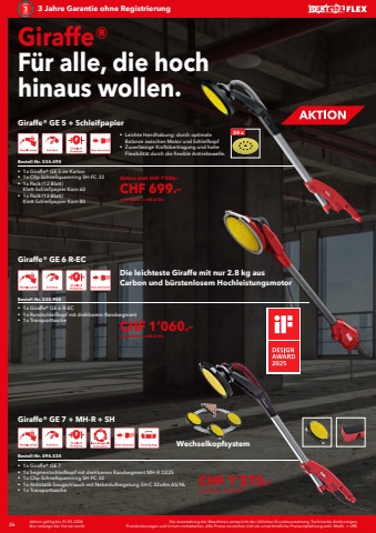 26 Die Ausstattung der Maschinen entspricht der %u00fcblichen Grundausstattung. Technische %u00c4nderungen, Preis%u00e4nderungen und Irrtum vorbehalten. Alle Preise verstehen sich als unverbindliche Preisempfehlung exkl. MwSt. + vRB.Aktion g%u00fcltig bis 31.03.2026Nur solange der Vorrat reicht3 Jahre Garantie ohne RegistrierungBestell-Nr. 534.490%u0083 1x Giraffe%u00ae GE 5 im Karton%u0083 1x Clip-Schnellspannring SH-FC 32%u0083 1x Pack (12 Blatt) Klett-Schleifpapier Korn 60%u0083 1x Pack (12 Blatt) Klett-Schleifpapier Korn 80Giraffe%u00ae GE 5 + Schleifpapier%u0083 Leichte Handhabung: durch optimale Balance zwischen Motor und Schleifkopf%u0083 Zuverl%u00e4ssige Kraft%u00fcbertragung und hohe Flexibilit%u00e4t durch die flexible Antriebswelle. 24 x Aktion statt CHF 1%u2019026.%u2013CHF 699.%u2013exkl. MwSt. + vRB (0.56)Bestell-Nr. 530.900%u0083 1x Giraffe%u00ae GE 6 R-EC%u0083 1x Rundschleifkopf mit drehbarem Randsegment%u0083 1x TransporttascheGiraffe%u00ae GE 6 R-ECDie leichteste Giraffe mit nur 2.8 kg aus Carbon und b%u00fcrstenlosem HochleistungsmotorCHF 1%u2019060.%u2013exkl. MwSt. + vRB (0.56)Bestell-Nr. 494.534%u0083 1x Giraffe%u00ae GE 7%u0083 1x Segmentschleifkopf mit drehbarem Randsegment MH-R D225%u0083 1x Clip-Schnellspannring SH-FC 32%u0083 1x Antistatik-Saugschlauch mit Nebenluftregelung SH-C 32x4m AS/NL%u0083 1x TransporttascheGiraffe%u00ae GE 7 + MH-R + SHWechselkopfsystemCHF 1%u2019275.%u2013exkl. MwSt. + vRB (0.56)Giraffe%u00ae F%u00fcr alle, die hoch hinaus wollen.