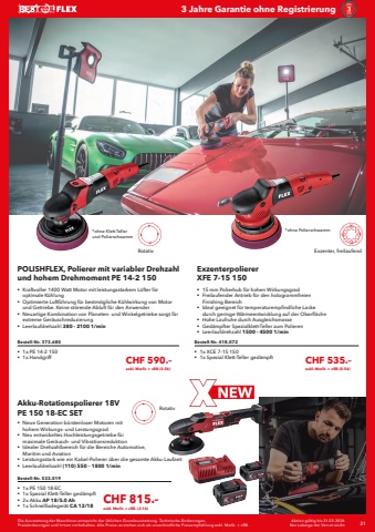 Die Ausstattung der Maschinen entspricht der %u00fcblichen Grundausstattung. Technische %u00c4nderungen, Preis%u00e4nderungen und Irrtum vorbehalten. Alle Preise verstehen sich als unverbindliche Preisempfehlung exkl. MwSt. + vRB. 31 Aktion g%u00fcltig bis 31.03.2026Nur solange der Vorrat reicht3 Jahre Garantie ohne RegistrierungAkku-Rotationspolierer 18V PE 150 18-EC SET%u0083 Neue Generation b%u00fcrstenloser Motoren mit hohem Wirkungs- und Leistungsgrad%u0083 Neu entwickeltes Hochleistungsgetriebe f%u00fcr maximale Ger%u00e4usch- und Vibrationsreduktion%u0083 Idealer Drehzahlbereich f%u00fcr die Bereiche Automotive, Maritim und Aviation%u0083 Leistungsstark wie ein Kabel-Polierer %u00fcber die gesamte Akku-Laufzeit%u0083 Leerlaufdrehzahl (110) 550 %u2013 1800 1/minBestell-Nr. 533.019%u0083 1x PE 150 18-EC%u0083 1x Spezial Klett-Teller ged%u00e4mpft%u0083 2x Akku AP 18/5.0 Ah%u0083 1x Schnellladeger%u00e4t CA 12/18CHF 815.%u2013exkl. MwSt. + vRB. (2.16)RotativPOLISHFLEX, Polierer mit variabler Drehzahl und hohem Drehmoment PE 14-2 150%u0083 Kraftvoller 1400 Watt Motor mit leistungsstarkem L%u00fcfter f%u00fcr optimale K%u00fchlung%u0083 Optimierte Luftf%u00fchrung f%u00fcr bestm%u00f6gliche K%u00fchlwirkung von Motor und Getriebe. Keine st%u00f6rende Abluft f%u00fcr den Anwender%u0083 Neuartige Kombination von Planeten- und Winkelgetriebe sorgt f%u00fcr extreme Ger%u00e4uschreduzierung%u0083 Leerlaufdrehzahl 380 - 2100 1/minBestell-Nr. 373.680%u0083 1x PE 14-2 150%u0083 1x Handgriff CHF 590.%u2013exkl. MwSt. + vRB (0.56)Exzenterpolierer XFE 7-15 150%u0083 15 mm Polierhub f%u00fcr hohen Wirkungsgrad%u0083 Freilaufender Antrieb f%u00fcr den hologrammfreien Finishing Bereich%u0083 Ideal geeignet f%u00fcr temperaturempfindliche Lacke durch geringe W%u00e4rmeentwicklung auf der Oberfl%u00e4che%u0083 Hohe Laufruhe durch Ausgleichsmasse%u0083 Ged%u00e4mpfter Spezialklett-Teller zum Polieren%u0083 Leerlaufdrehzahl 1500 - 4500 1/minBestell-Nr. 418.072%u0083 1x XCE 7-15 150%u0083 1x Spezial Klett-Teller ged%u00e4mpft CHF 535.%u2013exkl. MwSt. + vRB (0.56)*ohne Klett-Teller *ohne Polierschwammund PolierschwammRotativ Exzenter, freilaufend