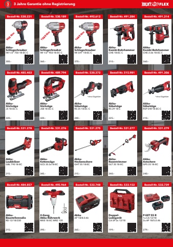 3 Jahre Garantie ohne RegistrierungBestell-Nr. 530.231 Bestell-Nr. 530.189 Bestell-Nr. 492.612 Bestell-Nr. 491.284 Bestell-Nr. 491.314Bestell-Nr. 485.403 Bestell-Nr. 489.794 Bestell-Nr. 530.372 Bestell-Nr. 515.981 Bestell-Nr. 491.306Bestell-Nr. 531.278 Bestell-Nr. 531.276 Bestell-Nr. 531.275 Bestell-Nr. 531.277 Bestell-Nr. 531.279Bestell-Nr. 484.857 Bestell-Nr. 495.964 Bestell-Nr. 532.748 Bestell-Nr. 533.152 Bestell-Nr. 532.739AkkuSchlagschrauberIW 1/2\300.%u2013AkkuSchlagschrauberIW 1/2\360.%u2013AkkuSchlagschrauberIW 3/4\370.%u2013AkkuKombi-BohrhammerCHE 18-EC C310.%u2013AkkuKombi-BohrhammerCHE 2-26 18-EC C360.%u2013AkkuStichs%u00e4geJS 18-EC C320.%u2013AkkuStichs%u00e4geJSB 18-EC C320.%u2013AkkuS%u00e4bels%u00e4geRS 25 18-EC C240.%u2013AkkuS%u00e4bels%u00e4geRS 29 18 C225.%u2013AkkuS%u00e4bels%u00e4geRSP DW 18-EC C310.%u2013AkkuLaubbl%u00e4serGBL 790 18-EC215.%u2013AkkuKettens%u00e4geGCS 35 2x18-EC345.%u2013AkkuHeckenschereGHT 55 18-EC215.%u2013AkkuRasentrimmerGLT 35 18-EC240.%u2013AkkuAstschereGPS 35 18-EC240.%u2013AkkuBaustellenradioRD 12/18/230215.%u20132-GangAkku-R%u00fchrwerkMXE 18-EC WR2 120390.%u2013AkkuAP 18/8.0 Ah265.%u2013DoppelLadeger%u00e4tCA SP 2x 12/18199.%u2013P-SET 55 R1x CA 12/182x AP 18/5.0 Ah279.%u2013950 Nm1580 Nm1680 Nm*ohne S%u00e4geblatt *ohne S%u00e4geblatt