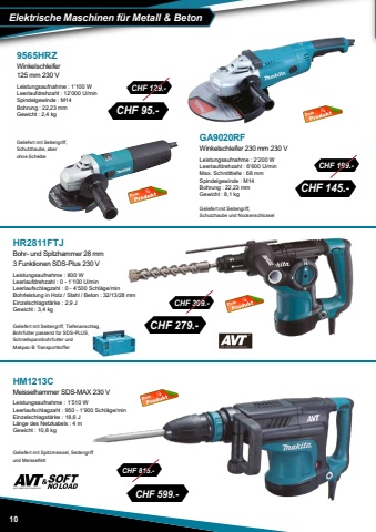 CHF 95.- CHF 129.- CHF 279.- CHF 399.- CHF 815.- CHF 599.-CHF 145.- CHF 199.- Elektrische Maschinen f%u00fcr Metall & BetonHR2811FTJ Bohr- und Spitzhammer 28 mm3 Funktionen SDS-Plus 230 VLeistungsaufnahme : 800 WLeerlaufdrehzahl : 0 - 1%u2019100 U/minLeerlaufschlagzahl : 0 - 4%u2019500 Schl%u00e4ge/minBohrleistung in Holz / Stahl / Beton : 32/13/28 mmEinzelschlagst%u00e4rke : 2,9 JGewicht : 3,4 kgGeliefert mit Seitengriff, Tiefenanschlag, Bohrfutter passend f%u00fcr SDS-PLUS, Schnellspannbohrfutter und Makpac-B TransportkofferHM1213CMeisselhammer SDS-MAX 230 VLeistungsaufnahme : 1%u2019510 WLeerlaufschlagzahl : 950 - 1%u2019900 Schl%u00e4ge/minEinzelschlagst%u00e4rke : 18,6 JL%u00e4nge des Netzkabels : 4 mGewicht : 10,8 kgGeliefert mit Spitzmeissel, Seitengriffund Meisselfett9565HRZWinkelschleifer125 mm 230 VLeistungsaufnahme : 1%u2019100 WLeerlaufdrehzahl : 12%u2019000 U/minSpindelgewinde : M14Bohrung : 22,23 mmGewicht : 2,4 kgGeliefert mit Seitengriff, Schutzhaube, aber ohne ScheibeGA9020RFWinkelschleifer 230 mm 230 VLeistungsaufnahme : 2%u2019200 WLeerlaufdrehzahl : 6%u2019600 U/minMax. Schnitttiefe : 68 mmSpindelgewinde : M14Bohrung : 22,23 mmGewicht : 8,1 kgGeliefert mit Seitengriff, Schutzhaube und Nockenschl%u00fcssel10