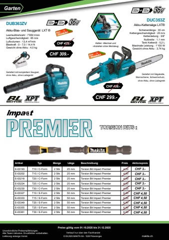 CHF 299.-CHF 409.-CHF 309.- CHF 429.-GartenUnverbindliche Preisempfehlungen.Alle Taxen inklusive. Druckfehler vorbehalten.Lieferung solange Vorrat. Verkauf nur %u00fcber den Fachhandel%u00a9 09.2025 MAKITA SA - 1028 Pr%u00e9verengesPreise g%u00fcltig vom 01.10.2025 bis 31.12.2025makita.chDUB363ZVAkku-Blas- und Saugger%u00e4t LXT %u00aeLeerlaufdrehzahl : 7%u2019850 t/minLuftgeschwindigkeit : 65 m/sLuftvolumen : 13,4 m%u00b3/minBlaskraft : 0 - 7,0 / 14,4 NGewicht ohne Akku : 4,0 kgGeliefert mit komplettem Saugset,ohne Akku, ohne Ladeger%u00e4tDUC353ZAkku-Kettens%u00e4ge LXT%u00aeSchienenl%u00e4nge : 35 cm Kettengeschwindigkeit : 20 m/sKettenteilung : 3/8%u201dNutbreite : 1,1 mmTank Ketten%u00f6l : 0,2 L Maximale Leistung : 1%u2019100 WGewicht ohne Akku : 3,74 kgGeliefert mit S%u00e4gekette, Sternschiene, Schwertschutz, ohne Akku, ohne Ladeger%u00e4tKetten -Wechsel und -Anziehen ohne Werkzeug.Artikel Typ Menge L%u00e4nge Beschreibung Preis AktionspreisE-03193 T10 / C-Form 2 Stk 25 mm Torsion Bit Impact Premier 4,50 CHF 3.-E-03202 T15 / C-Form 2 Stk 25 mm Torsion Bit Impact Premier 4,50 CHF 3.-E-03218 T20 / C-Form 2 Stk 25 mm Torsion Bit Impact Premier 4,50 CHF 3.-E-03224 T25 / C-Form 2 Stk 25 mm Torsion Bit Impact Premier 4,50 CHF 3.-E-03230 T30 / C-Form 2 Stk 25 mm Torsion Bit Impact Premier 4,50 CHF 3.-E-03327 T10 / E-Form 2 Stk 50 mm Torsion Bit Impact Premier 6,50 CHF 4,50E-03333 T15 / E-Form 2 Stk 50 mm Torsion Bit Impact Premier 6,50 CHF 4,50E-03349 T20 / E-Form 2 Stk 50 mm Torsion Bit Impact Premier 6,50 CHF 4,50E-03355 T25 / E-Form 2 Stk 50 mm Torsion Bit Impact Premier 6,50 CHF 4,50E-03361 T30 / E-Form 2 Stk 50 mm Torsion Bit Impact Premier 6,50 CHF 4,50TORSION BITS :