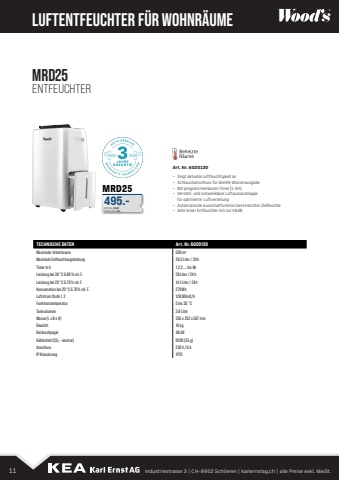 LUFTENTFEUCHTER F%u00dcR WOHNR%u00c4UMEArt. Nr. 6020120%u2013 Zeigt aktuelle Luftfeuchtigkeit an%u2013 Schlauchanschluss f%u00fcr direkte Wasserausgabe%u2013 Mit programmierbarem Timer (1%u20138 h)%u2013 Verstell- und schwenkbare Luftauslassklappe f%u00fcr optimierte Luftverteilung%u2013 Automatische Ausschaltfunktion bei erreichter Zielfeuchte%u2013 Sehr leiser Entfeuchter mit nur 48 dBMRD25MRD25ENTFEUCHTER495.-DTP INKL. 535.10LPREIS EXKL. 619.%u2013TECHNISCHE DATEN Art. Nr. 6020120Maximaler Arbeitsraum 500 m3Maximale Entfeuchtungsleistung 39,3 Liter/24hTimer in h 1,2,3 %u2026. bis 8hLeistung bei 30 %u00b0C & 80% rel. F. 28 Liter/24hLeistung bei 20 %u00b0C & 70% rel. F. 14.1 Liter/24hKonsumation bei 20 %u00b0C & 70% rel. F. 279WhLuftstrom Stufe 1, 2 128.180m3/hFunktionstemperatur 5 bis 35 %u00b0CTankvolumen 3.8 LiterMasse (L x B x H) 355 x 252 x 567 mmGewicht 16 kgGer%u00e4uschpegel 48 dBK%u00fchlmittel (CO%u2082 %u2013 neutral) R290 (55 g)Anschluss 230 V/6 AIP Klassierung 1P2211 Industriestrasse 3 | CH-8952 Schlieren | karlernstag.ch | alle Preise exkl. MwSt.