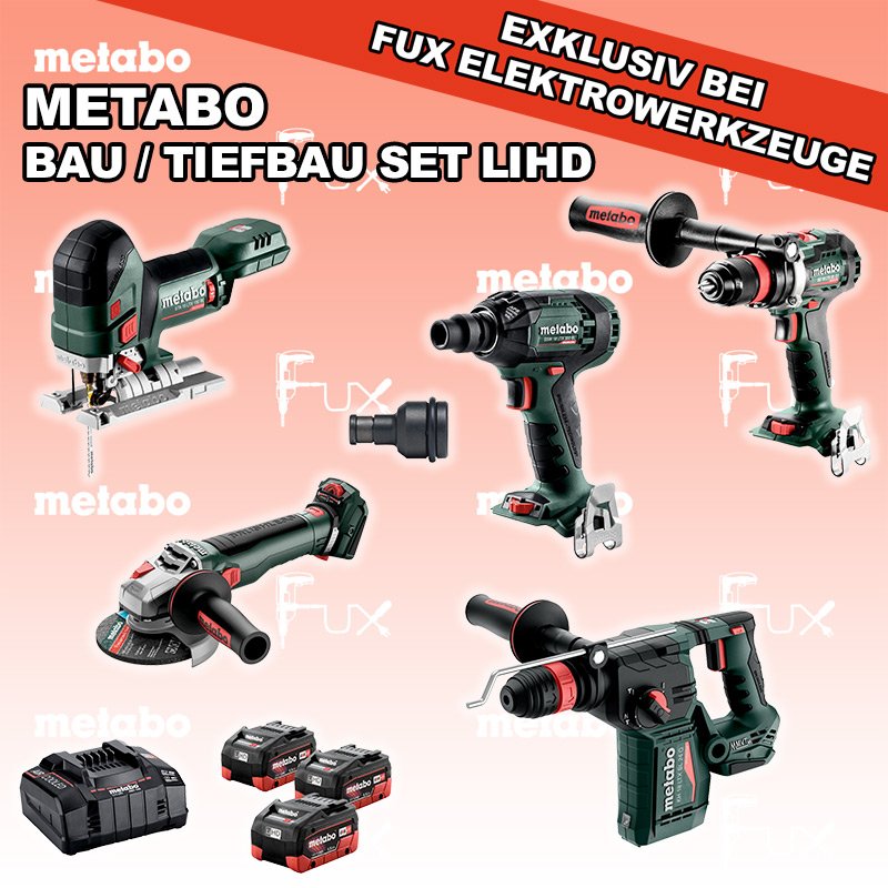 Heute auf dieses Produkt 31% Rabatt! Zu "Bau / Tiefbau Set" von Metabo FULL Service: 36 Monate zum Nulltarif für Sie! Weitere Infos zum FULL Service Sparfux Aktionen FUX SPECIAL EXKLUSIV BEI FUX Metabo Bau / Tiefbau Set 1 LiHD Bestell- und Artikelnummer: Bau / Tiefbau Set 1 LiHD BS 18 LTX BL Q I Akku-BohrschrauberAkkuspannung 18 V Drehzahl 0-550 / 0-2000 U/min Drehmoment hart / weich 130 / 65 Nm Gewicht (mit Akkupack) 2.3 kgInfos STA 18 LTX 150 BL Akku-StichsägeAkkuspannung 18 V Hubzahl 1.000-3.500 /min Gewicht ohne Akkupack 1.9 kgInfos KH 18 LTX BL 24 Q Akku-KombihammerAkkuspannung 18 V Einzelschlagstärke 2.2 J Bohrleistung in Beton 24 mm Gewicht ohne Akkupack 3 kgInfos WVB 18 LT BL 11-125 Quick Akku-WinkelschleiferAkkuspannung 18 V Drehzahl 2.800 - 10.000 / min Ø 125 mm Scheiben Gewicht (mit Akkupack) 2.5 kgInfos SSW 18 LTX 300 BL Akku-SchlagschrauberAkkuspannung 18 V Anziehdrehmoment 300 Nm Werkzeugaufnahme 1/2" Gewicht 1.7 kgInfos Reduktions Adapter 1/2" auf 1/4" Aufnahme Max. 350 Nm Länge 45 mmInfos 3 x 18 V, 5.5 Ah, LiHD Akkupack18 V 5.5 Ah ( LiHD Akkus ) Infos ASC 145, 12 - 36 V "Air Cooled" LadegerätZum Aufladen aller Li-Power Schiebesitz-Akkupacks (12 V - 36 V). Ladestrom 8.0 AInfos Registriere die in diesem Set vorhandenen Metabo Maschinen auf metabo.ch, und ergattere dir bis zu 5 Gratis Akkus!Zusätzlich offerieren wir zu diesem Set einen Gratis Akku! Standard-Ausrüstung In diesem Set enthalten: BS 18 LTX BL Q I Akku-Bohrschrauber STA 18 LTX 150 BL Akku-Stichsäge KH 18 LTX BL 24 Q Akku-Kombihammer WVB 18 LT BL 11-125 Quick Akku-Winkelschleifer SSW 18 LTX 300 BL Akku-Schlagschrauber Reduktions Adapter 3 x 18 V, 5.5 Ah, LiHD Akkupack ASC 145, 12 - 36 V "Air Cooled" Ladegerät Listenpreis CHF 2'252.00 Fuxpreis CHF 1'539.00 inkl. 8.1% MwSt, inkl vRG Frankolieferung Kein Grauimport! Produkt bestellen 1 Stück 2 Stück 3 Stück 4 Stück 5 Stück 6 Stück 7 Stück 8 Stück 9 Stück 10 Stück Alle Angaben ohne Gewähr und solange Vorrat reicht!Wiederverkäufer werden? Produkt als PDF NEUHEITAKTION 31%