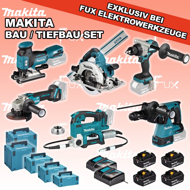 Makita Bau / Tiefbau Set 6 DDF492Z Akku-Bohrschrauber DJV18ZJ Akku-Stichsäge DHR243ZJ Akku-Bohrhammer DGA506ZJ Akku-Winkelschleifer DGP180Z Akku-Fettpresse DHS782ZJ Akku-Handkreissäge BL 1860 B ( Li-Ion Akku ) DC 18 RC Schnell-Ladegerät Führungsschiene L = 140 cm Adapter für Lube-Shuttle® 400G MAKPAC Gr. 2 Einsatz für diverse Akkuschrauber