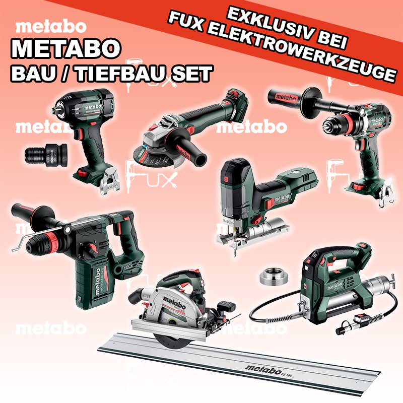 Zu "Bau / Tiefbau Set" von Metabo FULL Service: 36 Monate zum Nulltarif für Sie! Weitere Infos zum FULL Service FUX SPECIAL EXKLUSIV BEI FUX Metabo Bau / Tiefbau Set 8 SOLO Bestell- und Artikelnummer: Bau / Tiefbau Set 8 SOLO BS 18 LTX BL Q I Akku-BohrschrauberAkkuspannung 18 V Drehzahl 0-550 / 0-2000 U/min Drehmoment hart / weich 130 / 65 Nm Gewicht (mit Akkupack) 2.3 kgInfos ST 18 LT 130 BL Akku-StichsägeAkkuspannung 18 V Hubzahl 1000-3.500 /min Gewicht ohne Akkupack 1.5 kgInfos KH 18 LTX BL 24 Q Akku-KombihammerAkkuspannung 18 V Einzelschlagstärke 2.2 J Bohrleistung in Beton 24 mm Gewicht ohne Akkupack 3 kgInfos WVB 18 LT BL 11-125 Quick Akku-WinkelschleiferAkkuspannung 18 V Drehzahl 2.800 - 10.000 / min Ø 125 mm Scheiben Gewicht (mit Akkupack) 2.5 kgInfos SSW 18 LTX 550 BL Akku-SchlagschrauberAkkuspannung 18 V Anziehdrehmoment 550 Nm Werkzeugaufnahme 1/2" Gewicht ohne Akkupack 1,4 kgInfos FP 18 LTX Akku FettpresseAkkuspannung 18 V Maximaler Druck 690 bar Auspressgeschwindigkeit 100 / 290 ml/min Gewicht inkl. Akku 4.4 kgInfos KS 18 LTX 66 BL Akku HandkreissägeAkkuspannung 18 V Schnitt-Tiefe bei 90° 0-66 mm Sägeblatt 165 mm Gewicht 4.5 kgInfos FS 160 FührungsschieneGesamtlänge 1600 mmInfos Adapter für Lube-Shuttle® 400GAdapter zum Umrüsten von Fettbehälter auf Lube-Shuttle®* Kartusche 400g geeignet für FP 18 LTXInfos Adapter mit 1/2“ auf 1/4"Adapter mit 1/2“ Innenvierkant maschinenseitig und 1/4“ Innensechskant für schlagfeste Einsatzwerkzeuge mit 1/4“ SchaftInfos Registriere die in diesem Set vorhandenen Metabo Maschinen auf metabo.ch, und ergattere dir bis zu 5 Gratis Akkus!Zusätzlich offerieren wir zu diesem Set einen Gratis Akku!OHNE AKKUS UND LADEGERÄT Standard-Ausrüstung In diesem Set enthalten: BS 18 LTX BL Q I Akku-Bohrschrauber ST 18 LT 130 BL Akku-Stichsäge KH 18 LTX BL 24 Q Akku-Kombihammer WVB 18 LT BL 11-125 Quick Akku-Winkelschleifer SSW 18 LTX 550 BL Akku-Schlagschrauber FP 18 LTX Akku Fettpresse KS 18 LTX 66 BL Akku Handkreissäge FS 160 Führungsschiene Adapter für Lube-Shuttle® 400G Adapter mit 1/2“ auf 1/4" Listenpreis CHF 2'636.00 Fuxpreis CHF 1'802.00 inklusive 8.1% MwSt Frankolieferung Kein Grauimport! Produkt bestellen 1 Stück 2 Stück 3 Stück 4 Stück 5 Stück 6 Stück 7 Stück 8 Stück 9 Stück 10 Stück Alle Angaben ohne Gewähr und solange Vorrat reicht!Wiederverkäufer werden? Produkt als PDF NEUHEITAKTION 31%