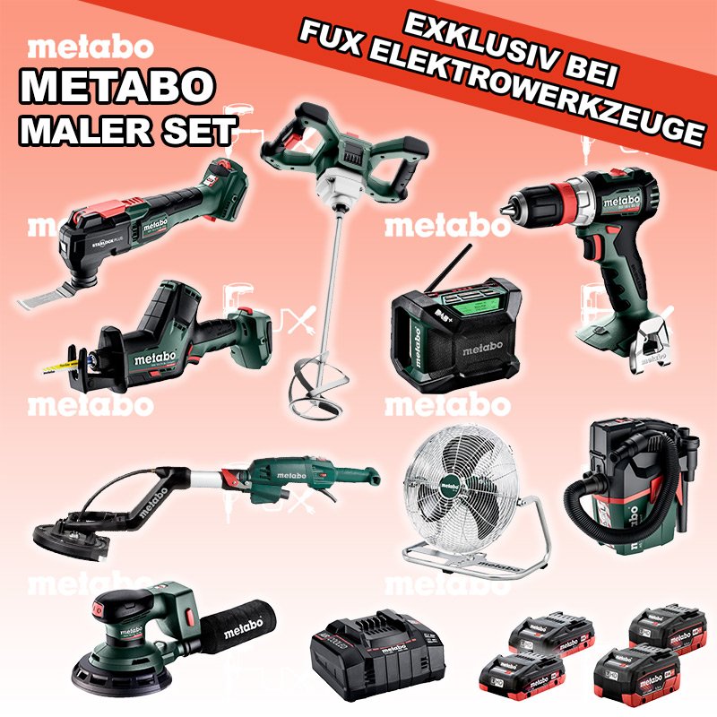 Zu "Maler Set" von Metabo FULL Service: 36 Monate zum Nulltarif für Sie! Weitere Infos zum FULL Service FUX SPECIAL EXKLUSIV BEI FUX Metabo Maler Set 5 Bestell- und Artikelnummer: Maler Set 5 BS 18 L BL Q Akku-BohrschrauberAkkuspannung 18 V Drehzahl 0 - 500 / 0 - 1700 /min Drehmoment hart / weich 60 / 28 Nm Gewicht (mit Akkupack) 1.3 kgInfos RW 18 LTX BL 120 Akku-RührwerkAkkuspannung 18 V Max. Rührkorb-Durchmesser 120 mm Max. empfohlene Mischmenge 30 l Werkzeugaufnahme Innengewinde M 14 Infos AS 18 L PC Compact Akku-Sauger Akkuspannung 18 V Luftleistung max. 2100 l/min Unterdruck 120 hPa (mbar) Behältervolumen 6 lInfos SXA 18 LTX 150 BL Exzenterschleifer Akkuspannung 18 V Durchmesser des Stütztellers 150 mm Leerlaufdrehzahl 4000 - 10000 /min Gewicht (mit Akkupack) 1.7 kg Infos R 12-18 DAB+ BT Akku-BaustellenradioDAB+ Akkuspannung 12 V / 18 V Extreme Akkupacks mit 14,4 und 18 Volt Gewicht 1.85 kgInfos SSE 18 LTX BL Compact Akku-SäbelsägeAkkuspannung 18 V Hubzahl 0-3000 min-1 Hublängen 16 mm Gewicht (mit Akkupack) 1.8 kgInfos MT 18 LTX BL QSL Akku-Multitool Akkuspannung 18 V Schwingzahl bei Leerlauf 8.000 - 20.000 /min Schleifplatte, Maß Eck zu Eck 93 mm Gewicht 1.7 kgInfos AV 18 Akku-VentilatorAkkuspannung 18 V Max. Luftgeschwindigkeit 3,8 m/s Flügeldurchmesser 355 mm Gewicht (mit Akkupack) 1,2 kgInfos LSV 5-225 Comfort LanghalsschleiferLeistungsaufnahme 500 Watt Durchmesser Schleifteller 225 mm Leerlaufdrehzahl 1000 - 1650 min-1 Gewicht 4.5 kgInfos 2 x 18 V, 4.0 Ah, LiHD Akkupack18 V 4.0 Ah ( LiHD Akkus ) Infos 2 x 18 V, 5.5 Ah, LiHD Akkupack18 V 5.5 Ah ( LiHD Akkus ) Infos ASC 145, 12 - 36 V "Air Cooled" LadegerätZum Aufladen aller Li-Power Schiebesitz-Akkupacks (12 V - 36 V). Ladestrom 8.0 AInfos Registriere die in diesem Set vorhandenen Metabo Maschinen auf metabo.ch, und ergattere dir bis zu 5 Gratis Akkus!Zusätzlich offerieren wir zu diesem Set einen Gratis Akku! Standard-Ausrüstung In diesem Set enthalten: BS 18 L BL Q Akku-Bohrschrauber RW 18 LTX BL 120 Akku-Rührwerk AS 18 L PC Compact Akku-Sauger SXA 18 LTX 150 BL Exzenterschleifer R 12-18 DAB+ BT Akku-Baustellenradio SSE 18 LTX BL Compact Akku-Säbelsäge MT 18 LTX BL QSL Akku-Multitool AV 18 Akku-Ventilator LSV 5-225 Comfort Langhalsschleifer 2 x 18 V, 4.0 Ah, LiHD Akkupack 2 x 18 V, 5.5 Ah, LiHD Akkupack ASC 145, 12 - 36 V "Air Cooled" Ladegerät Listenpreis CHF 3'422.00 Fuxpreis CHF 2'474.00 inklusive 8.1% MwSt Frankolieferung Kein Grauimport! Produkt bestellen 1 Stück 2 Stück 3 Stück 4 Stück 5 Stück 6 Stück 7 Stück 8 Stück 9 Stück 10 Stück Alle Angaben ohne Gewähr und solange Vorrat reicht!Wiederverkäufer werden? Produkt als PDF NEUHEITAKTION 27%