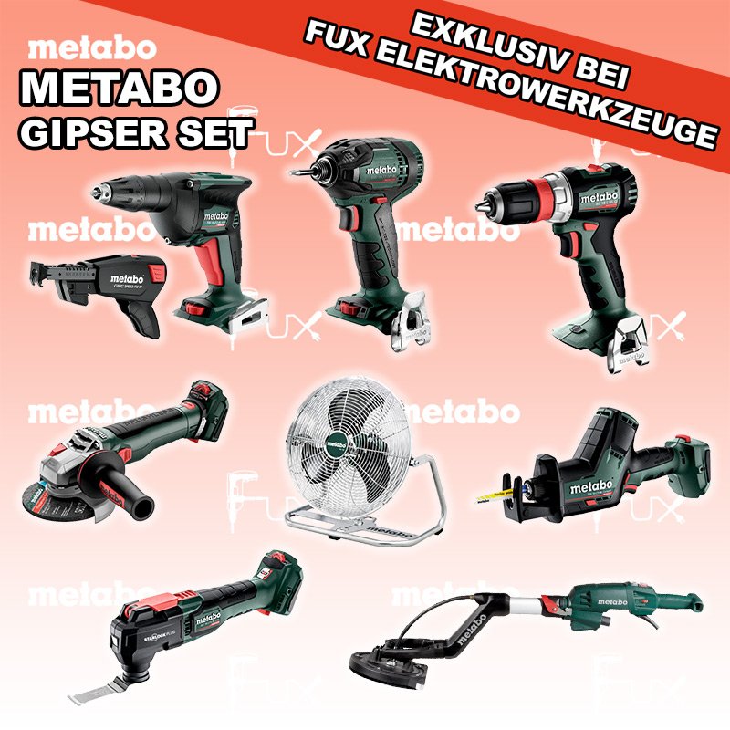 Zu "Gipser Set" von Metabo FUX SPECIAL EXKLUSIV BEI FUX Metabo Gipser Set 11 SOLO Bestell- und Artikelnummer: Gipser Set 11 SOLO FULL Service: 36 Monate zum Nulltarif für Sie! Weitere Infos zum FULL Service BS 18 L BL Q Akku-BohrschrauberAkkuspannung 18 V Drehzahl 0 - 500 / 0 - 1700 /min Drehmoment hart / weich 60 / 28 Nm Gewicht (mit Akkupack) 1.3 kgInfos TBS 18 LTX BL 5000 Akku-TrockenbauschrauberAkkuspannung 18 V Leerlaufdrehzahl 0 - 5.000 /min Max. Drehmoment weich 6 Nm Gewicht mit Akkupack 1,3 kgInfos SSD 18 LTX 200 BL Akku-Schlagschrauber Akkuspannung 18 V Anziehdrehmoment 200 Nm Werkzeugaufnahme 1/4" Gewicht 1.3 kgInfos WVB 18 LT BL 11-125 Quick Akku-WinkelschleiferAkkuspannung 18 V Drehzahl 2.800 - 10.000 / min Ø 125 mm Scheiben Gewicht (mit Akkupack) 2.5 kgInfos SSE 18 LTX BL Compact Akku-SäbelsägeAkkuspannung 18 V Hubzahl 0-3000 min-1 Hublängen 16 mm Gewicht (mit Akkupack) 1.8 kgInfos MT 18 LTX BL QSL Akku-Multitool Akkuspannung 18 V Schwingzahl bei Leerlauf 8.000 - 20.000 /min Schleifplatte, Maß Eck zu Eck 93 mm Gewicht 1.7 kgInfos AV 18 Akku-VentilatorAkkuspannung 18 V Max. Luftgeschwindigkeit 3,8 m/s Flügeldurchmesser 355 mm Gewicht (mit Akkupack) 1,2 kgInfos LSV 5-225 Comfort LanghalsschleiferLeistungsaufnahme 500 Watt Durchmesser Schleifteller 225 mm Leerlaufdrehzahl 1000 - 1650 min-1 Gewicht 4.5 kgInfos Schrauber-Magazin Speed Fix 57Robustes Schrauber-Magazin geeignet für TBS 18 LTX 5000 und HBS 18 LTX 3000Infos Registriere die in diesem Set vorhandenen Metabo Maschinen auf metabo.ch, und ergattere dir bis zu 5 Gratis Akkus!Zusätzlich offerieren wir zu diesem Set einen Gratis Akku!OHNE AKKUS UND LADEGERÄT Standard-Ausrüstung In diesem Set enthalten: BS 18 L BL Q Akku-Bohrschrauber TBS 18 LTX BL 5000 Akku-Trockenbauschrauber SSD 18 LTX 200 BL Akku-Schlagschrauber WVB 18 LT BL 11-125 Quick Akku-Winkelschleifer SSE 18 LTX BL Compact Akku-Säbelsäge MT 18 LTX BL QSL Akku-Multitool AV 18 Akku-Ventilator LSV 5-225 Comfort Langhalsschleifer Schrauber-Magazin Speed Fix 57 Listenpreis CHF 2'913.50 Fuxpreis CHF 2'010.00 inklusive 8.1% MwSt Frankolieferung Kein Grauimport! Produkt bestellen 1 Stück 2 Stück 3 Stück 4 Stück 5 Stück 6 Stück 7 Stück 8 Stück 9 Stück 10 Stück Alle Angaben ohne Gewähr und solange Vorrat reicht!Wiederverkäufer werden? Produkt als PDF NEUHEITAKTION 31%
