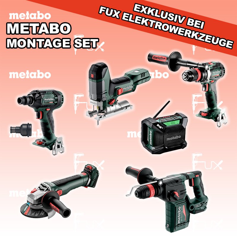 Zu "Montage Set" von Metabo FUX SPECIAL EXKLUSIV BEI FUX Metabo Montage Set 5 SOLO Bestell- und Artikelnummer: Montage Set 5 SOLO FULL Service: 36 Monate zum Nulltarif für Sie! Weitere Infos zum FULL Service Dieses Produkt ist CAS kompatibel! Weitere Infos zu CAS ST 18 LT 130 BL Akku-StichsägeAkkuspannung 18 V Hubzahl 1000-3.500 /min Gewicht ohne Akkupack 1.5 kgInfos KH 18 LTX BL 24 Q Akku-KombihammerAkkuspannung 18 V Einzelschlagstärke 2.2 J Bohrleistung in Beton 24 mm Gewicht ohne Akkupack 3 kgInfos WB 18 LTX BL 15-125 Quick Akku-Winkelschleifer Akkuspannung 18 V so stark wie ein 1500 Watt Netzgerät Drehzahl 10000 U / min Ø 125 mm Scheiben Gewicht mit Akkupack 2,7 kgInfos SSW 18 LTX 300 BL Akku-SchlagschrauberAkkuspannung 18 V Anziehdrehmoment 300 Nm Werkzeugaufnahme 1/2" Gewicht 1.7 kgInfos R 12-18 DAB+ BT Akku-BaustellenradioDAB+ Akkuspannung 12 V / 18 V Extreme Akkupacks mit 14,4 und 18 Volt Gewicht 1.85 kgInfos BS 18 LTX BL Q I Akku-BohrschrauberAkkuspannung 18 V Drehzahl 0-550 / 0-2000 U/min Drehmoment hart / weich 130 / 65 Nm Gewicht (mit Akkupack) 2.3 kgInfos Reduktions Adapter 1/2" auf 1/4" Aufnahme Max. 350 Nm Länge 45 mmInfos Registriere die in diesem Set vorhandenen Metabo Maschinen auf metabo.ch, und ergattere dir bis zu 5 Gratis Akkus!Zusätzlich offerieren wir zu diesem Set einen Gratis Akku!OHNE AKKUS UND LADEGERÄT Standard-Ausrüstung In diesem Set enthalten: ST 18 LT 130 BL Akku-Stichsäge KH 18 LTX BL 24 Q Akku-Kombihammer WB 18 LTX BL 15-125 Quick Akku-Winkelschleifer SSW 18 LTX 300 BL Akku-Schlagschrauber R 12-18 DAB+ BT Akku-Baustellenradio BS 18 LTX BL Q I Akku-Bohrschrauber Reduktions Adapter Zubehör Verbrauchsmaterial Listenpreis CHF 1'899.00 Fuxpreis CHF 1'139.00 inklusive 8.1% MwSt Versand CHF 40.00 Kein Grauimport! Produkt bestellen 1 Stück 2 Stück 3 Stück 4 Stück 5 Stück 6 Stück 7 Stück 8 Stück 9 Stück 10 Stück Alle Angaben ohne Gewähr und solange Vorrat reicht!Wiederverkäufer werden? Produkt als PDFVideo LiHD 1Video LiHD 2 NEUHEITAKTION 40%